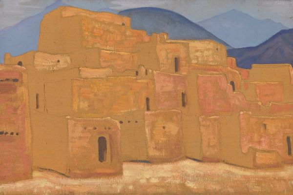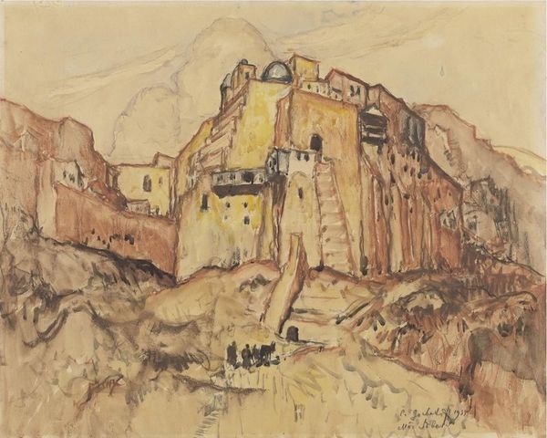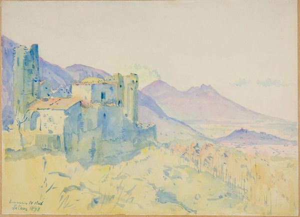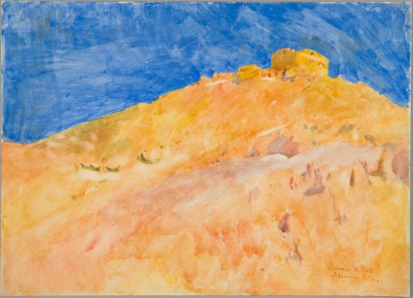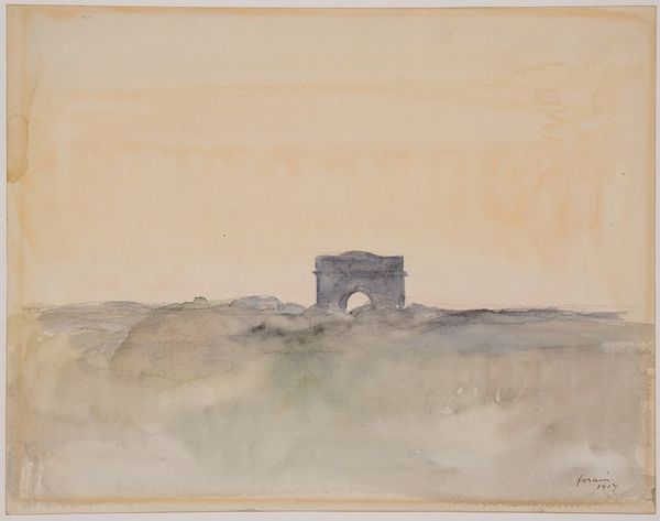 Curator: I’m immediately struck by the shimmering heat radiating from this watercolor. It’s like looking at a mirage. Editor: This is Denman Waldo Ross's "Ruined Building, Assouan, Egypt." The current location of the work is the Harvard Art Museums. Curator: There's a sense of impermanence, isn't there? The crumbling structure almost melts into the landscape. Perhaps it’s also a reflection on colonialism and the relics of empires. Editor: Absolutely. Ross, painting this in 1896, positions himself as an observer, a tourist gazing upon a landscape shaped by complex power dynamics. It could even be interpreted as a comment on the transience of power itself. Curator: I see that in the brushstrokes. Loose, gestural, as if the building is actively dissolving before our eyes, returning to the earth from whence it came. Editor: It serves as a quiet but potent reminder of the ebb and flow of history. Curator: Yes, a world where everything, even the mightiest empires, fades away, leaving behind only the ghost of a memory. Editor: And that Ross captures that so delicately in watercolor makes it all the more haunting.