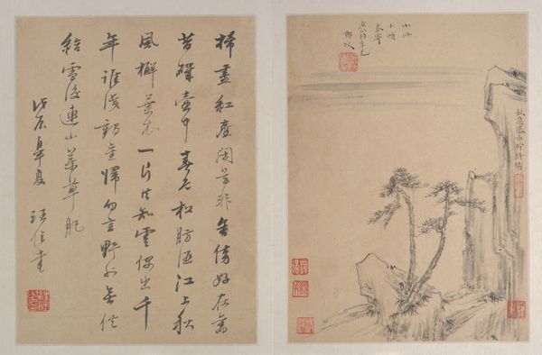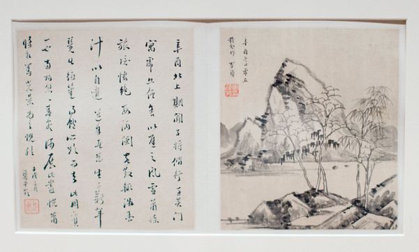 Editor: So, this is Nukina Kaioku's "Gathering of the Jewels," created in 1861. It’s a watercolor and colored pencil drawing. It reminds me of a tranquil little cove. How do you interpret this work, considering the techniques the artist employed? Curator: The formal structure of the work is compelling. Notice how the artist divides the composition. On the left, we observe a detailed landscape scene, and on the right, the balance of the drawing is offset by the calligraphic script. What do you notice about the tonal variations in each panel? Editor: Well, the landscape seems more airy with very delicate coloration, particularly with the foliage, whereas the text panel feels almost like a solid, dark mass in comparison. Curator: Precisely. That contrast directs our visual reading. Kaioku forces us to analyze the relationship between form and script. The lines of the calligraphy, dense and vertical, create a different visual rhythm compared to the gentle slopes of the landscape. It explores pictorial depth using flat washes and then counteracts it. Editor: I see! So, it’s less about what is depicted, and more about how Kaioku used contrast, color, and line to construct the visual experience? Curator: Exactly. Observe the bridge, and how it intersects at precise diagonals. This use of space contributes to its dynamic arrangement. What seems tranquil on the surface contains a subtle yet sophisticated engagement of contrasting aesthetics. Editor: It’s funny, I didn’t consider the calligraphy as part of the artwork, more like a descriptive accompaniment. Now I see the tension. Curator: It's in the formal relationship. By studying its visual language, we have gained an insight into the dynamic dialogue of form in Kaioku’s work.