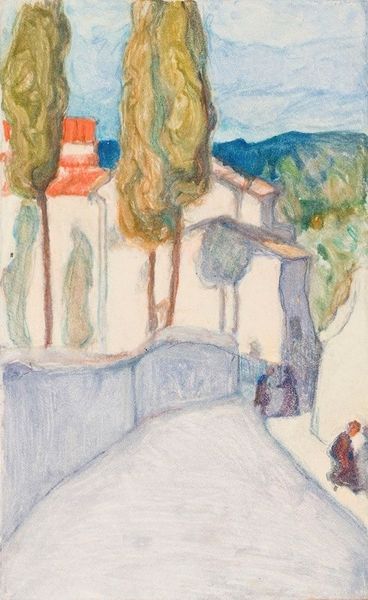 Curator: This watercolor by Sasza Blonder, dating from 1934, is titled "Rowerzysta na tle pejzażu," which translates to "Cyclist Against a Landscape." Editor: Ah, yes, the jaunty cyclist, sort of breezing through a dream. It feels almost musical, a little off-key, like a Satie composition… but warmer. Is it just me or are the shapes flirting with total abstraction? Curator: Not merely flirting, I'd say embracing it! Blonder's reduction of the landscape to geometric forms—the triangular suggestion of hills, the circular motifs representing sun or perhaps even a moon—places this work squarely within modernist abstraction. The color palette, predominantly muted blues, browns, and greens, reinforces this reduction. Editor: Right, that palette. The washed-out effect softens the edges, though, giving it this wistful quality. The cyclist, however simplified, is rendered with affection. He seems very determined for a fellow in such a gauzy world! The bright blue wheels of his bicycle pop against the other more diluted hues. Curator: Precisely. Note the interplay between the defined contours of the cyclist and the fluidity of the landscape, rendered in broad strokes. Blonder creates tension, perhaps a commentary on man’s interaction with nature, a recurrent theme of that period. Editor: I also see how the background has another similar small orb to the large circle, they both create such depth... maybe it means something but maybe it just is what it is. Curator: The overall composition leans on geometric order while inviting an emotional, if subdued, response from the viewer. It presents us with a series of formal problems, resolved with a degree of playful detachment. Editor: Absolutely. The little man keeps pedaling onward. So charming, even though it's an intellectual piece! I wonder what kind of story he would tell if he could. Curator: Well, considering the time it was painted, there's perhaps a quiet resistance woven in there too. Editor: Yes, resistance and hope. Definitely a bike ride worth taking.