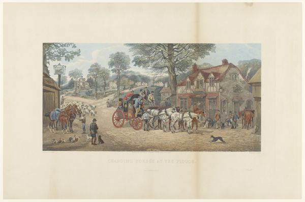 Curator: This delightful print by Thomas B. Worth, made around 1869, is entitled "Fashionable 'Turn-Outs' in Central Park." Editor: Oh, the energy! It's just teeming with upper-class leisure and the almost frenetic activity of… horses. The composition is wonderful, a spiraling collection of carriages. You can practically smell the leather and feel the jostle. Curator: Indeed. Worth captures a slice of life within the newly established Central Park, meant as a democratic space, yet largely defined by class and social spectacle. Consider the materiality, a printed image that’s broadly reproducible. How does that sit against its seemingly exclusive subject matter? Editor: Precisely! The means of production, easily disseminated prints, belies the elitist world depicted. The polished wheels, the horseflesh – these are markers of wealth on parade. Note the contrast with, say, lithographs depicting laborers; same technique, vastly different social functions. What kind of labor goes into crafting the clothes and accessories, too? It all matters. Curator: And the ‘Turn-Outs’ themselves—the equipage, horses, livery—were judged according to strict social codes. A faulty turn-out could mean social embarrassment and demotion of status. This wasn't just a Sunday ride; it was performance. Look at the clothing; a costume meant to telegraph wealth. Editor: Costume is right! Look closely; all that fabric, the top hats. So many manufactured goods coming together in one fleeting, material display. The environmental costs alone! You could analyze an entire industrial revolution from these details, like a fossil preserved in amber. Curator: We're seeing class mobility made manifest, or perhaps fantasized, through display and material possessions. Parks are such potent spaces for these societal negotiations and public performances. What an incisive social commentary conveyed with this artist’s choices in plein air drawing and printmaking. Editor: I think the combination of artistic production and this public display create something worth unpacking. The speed, wealth and class differences are so apparent as we study these people and this art, it's like it hasn't changed.