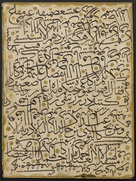 Curator: This striking ceramic relief tile, originating sometime between 891 and 1507, served as a tombstone. Islamic art often integrates calligraphy so the lettering you see is as important as the symbolism and geometric patterning, offering layered insight into the commissioner’s identity and religious views. Editor: Oh, wow. I’m immediately struck by its serene palette – pale blue bordering an earthy ochre. Despite being a fragment of the past, it feels remarkably fresh, like a piece of sky cradling ancient secrets. Curator: Exactly. We see that the calligraphy is central here, a devotional inscription in Arabic, conveying details about the deceased, whose name was Sa’id Ibnak Muhammad. But the script also reflects the sociopolitical power structures of the time period and the role of artistic expression within these dynamics. The placement, the form...they're all loaded. Editor: It reminds me that even in remembrance, identity is actively constructed, right? I mean, someone chose those words, that style... It speaks to the universal human desire to be remembered, to leave a mark, but with a very particular cultural spin. Almost like composing your own eulogy. Curator: Precisely. Tombstones offer insight into a community's value system concerning gender, social standing, even religious doctrine. Consider this tombstone within that context; we understand it to be more than simply an inscription. The artistic presentation is key, adding to the complexities of understanding personhood and power dynamics. Editor: It also highlights art’s ability to immortalize…in a way. This tile allows a fleeting life to resonate across centuries, whispering stories of faith, artistry, and mortality. What else can ceramic do that for you, you know? Makes you wonder who is seeing us through their art, down the line? Curator: Indeed, pondering the piece invites contemplation beyond mere identity; rather, a broader analysis of shared human practices over epochs of both loss and lasting artistic expression. It encapsulates historical narratives in very accessible strokes, that's for sure. Editor: Totally, a poetic encapsulation of life's ephemeral nature in this humble tombstone. Curator: I fully concur.