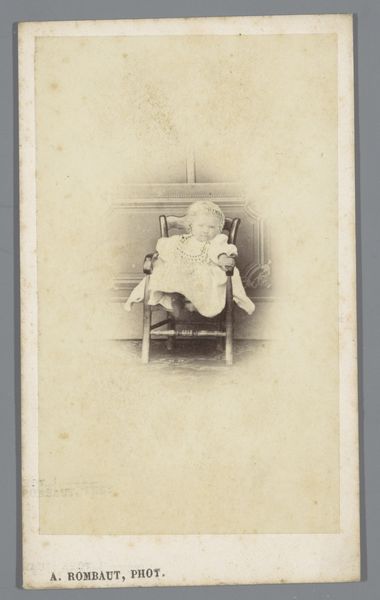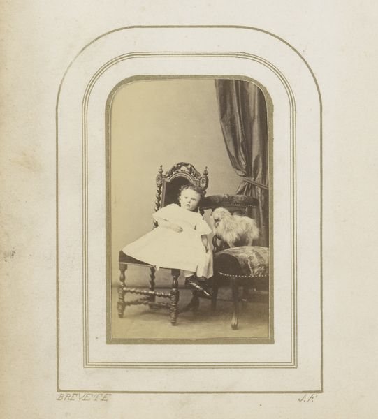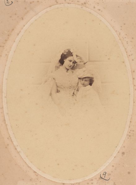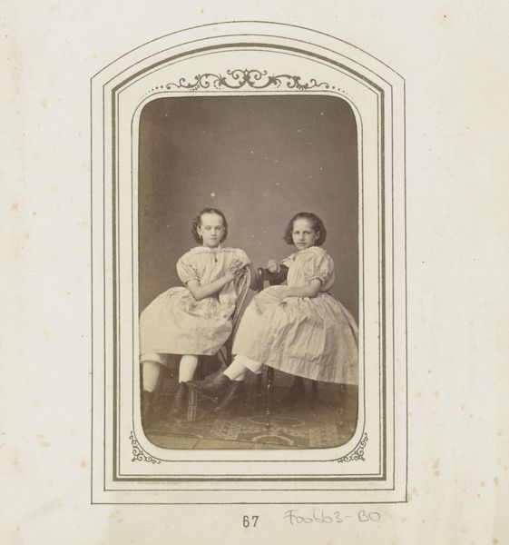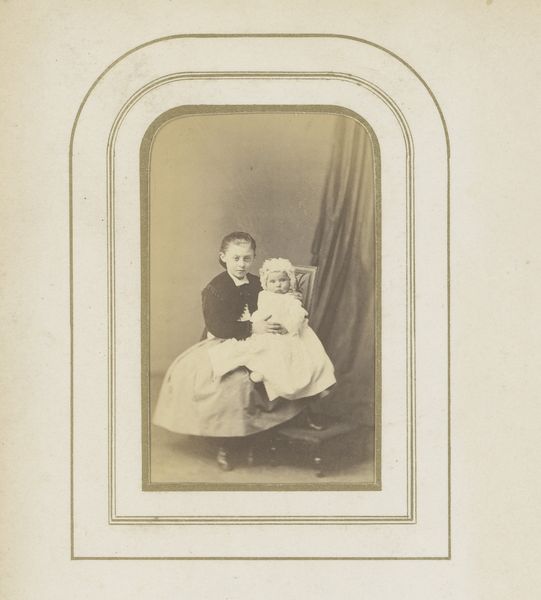 Curator: Here we see “Portret van twee meisjes,” or "Portrait of two girls" a photographic work, tentatively dated to 1904 and attributed to J. & J. Schotel Szn. Editor: The photograph's oval frame immediately conjures a Victorian mood. It feels restrained, almost melancholic, in its subdued tones. Curator: Precisely! Consider the cultural coding here. Photography, then a relatively new medium, was embraced for portraiture but its use solidified notions of idealised childhood, captured and preserved. Do you see any specific imagery that stands out to you? Editor: Well, the girl clutching a doll certainly points to notions of innocence, but it also makes me consider the performative aspect of girlhood in this era, the enforced expectation of domesticity through toys like this. Curator: Yes, dolls often appear and are symbolic stand-ins for future motherhood or miniature representations of feminine social roles. Also, the slight formality of their attire, even in what looks to be an informal pose, tells us about the constraints placed upon children in that era, reflecting on respectability and class. It is interesting also to look at the history of photography; did photography play a role in solidifying class structures? Editor: I'd argue it certainly did. Photography helped create a visual archive but, also, the accessibility was stratified. These visual tropes become cemented, naturalising specific socio-economic ideals of race, gender, and class into something presented as "everyday," and innocent like in a portrait of two little girls. Curator: Indeed, photography freezes fleeting moments, offering, and constructing visual stories loaded with the period’s implicit assumptions about youth and innocence. This creates its own cultural symbols, like an icon for their era. Editor: Reflecting on it, the photo isn't *simply* sweet. The solemnity hints at those societal expectations and limitations of their girlhood. Curator: Yes, beneath the surface are the quiet markers of that time and the complex matrix of socio-political norms of the period.