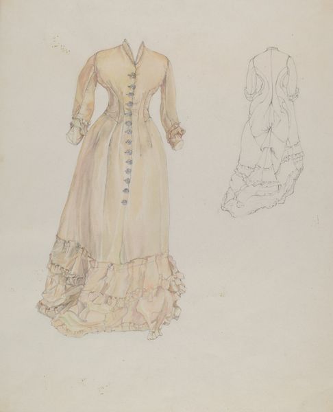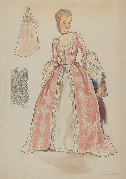 Editor: This drawing from around 1940, titled "Dress," is attributed to Jean Peszel and uses acrylic paint and drawing on paper. It has such an airy quality! What do you make of the artist's technique here? Curator: Note how Peszel leverages the formal elements to structure our perception. Observe the repetition of striped and plaid patterns. How do these patterns create a dialogue within the artwork itself, guiding the viewer's eye? Editor: I see the patterns. What is the significance of that dialogue? Curator: The dialogue between these ordered forms presents structure and a counterpoint through ruffled edges. Consider the composition's inherent qualities, the texture created by the rendering of the fabric. The artist masterfully controls line and shape. Editor: So the essence is not about the subject but the elements employed in its creation? Curator: Precisely. Reflect upon the artist's decisions: the balance of forms, the strategic deployment of color, and the use of negative space, how it all creates an independent aesthetic experience. Editor: So it’s about the inherent visual language. This close looking helps appreciate art more profoundly! Curator: Indeed! By dissecting these formal components, we arrive at a deeper comprehension of the artwork's internal logic.