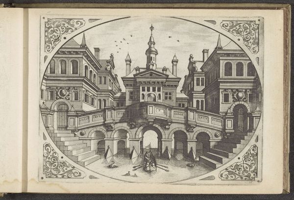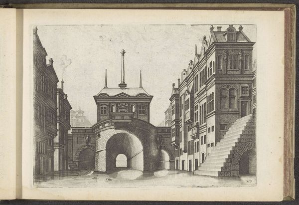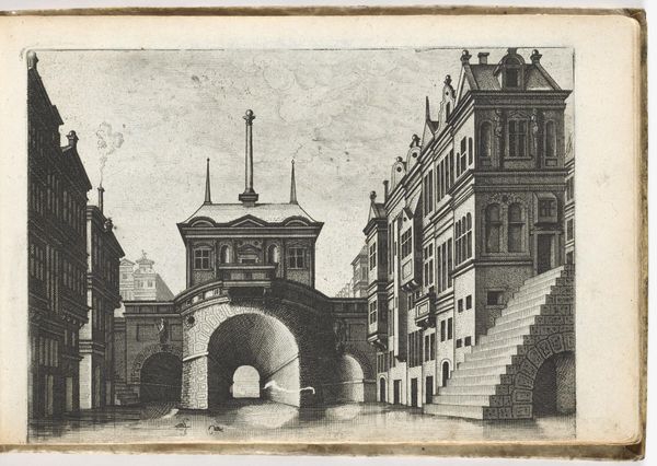 Curator: This etching is called "View from a Canal of the Gate Bridge with Shutters of a Fortified Town, Street Facade on the Right (N. H.)" by Joannes van Doetecum. It's quite small, only about 15 by 21 centimeters, and housed here at Harvard. Editor: What a deliciously eerie city! The light is fantastic, the way it cuts through the fortified gateway. It gives me a slightly unsettling feeling though, like I'm looking at a dream. Curator: Well, these elaborate fortifications speak to the political landscape and the constant need for defense in that period. Notice the gate itself—it's not just for show; it's a key part of urban infrastructure and control. Editor: Yes, and even the way the boats are rendered. All these small, busy, working figures create an atmosphere where labor and life intertwine with architecture and governance. Curator: Exactly. The etching process itself, with its precise lines and tonal gradations, was essential for disseminating images and information during that era. Editor: You know, I can almost hear the faint splash of oars and the murmurs of the city's inhabitants. This small slice of life—carefully crafted—still speaks so powerfully. Curator: Indeed. It serves as a fascinating artifact documenting the complex intersection of power, trade, and daily life in the early modern period. Editor: Thanks! Now I see it differently. It’s more than just a pretty picture!