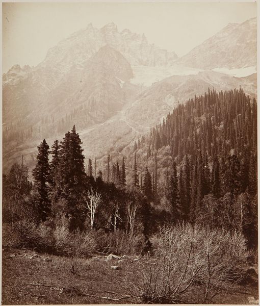 Curator: Samuel Bourne's "Wanga Valley" captures a majestic vista. It evokes a sense of sublime awe, wouldn't you agree? The sheer scale, the contrast between the dark forest and glacial peaks... Editor: Bourne's photography in colonial India certainly intersects with the imperial gaze. His work romanticizes the landscape, subtly reinforcing a narrative of dominion. Curator: Yet, consider also the technical mastery. Bourne lugged heavy equipment to capture these images. The tonal range he achieves, the way the light reflects off the ice...it's remarkable. Editor: And while we admire the technical skill, we must also question its purpose. Who was this image for? What power dynamics are at play in its creation and consumption? Curator: Perhaps it's both. A testament to photographic skill and a product of its time, inviting us to consider its complex legacy. Editor: Precisely. It’s a powerful reminder that beauty and ideology are not mutually exclusive.