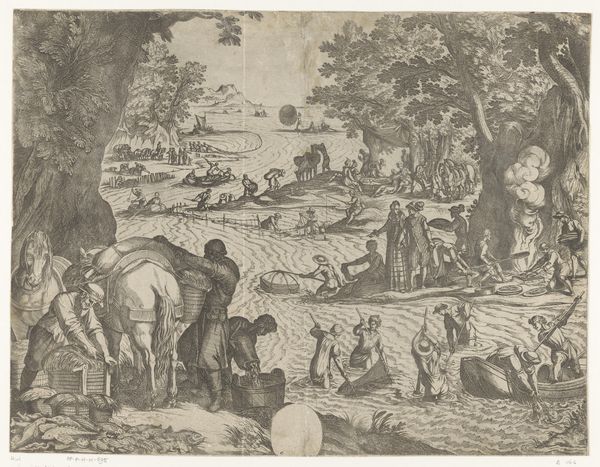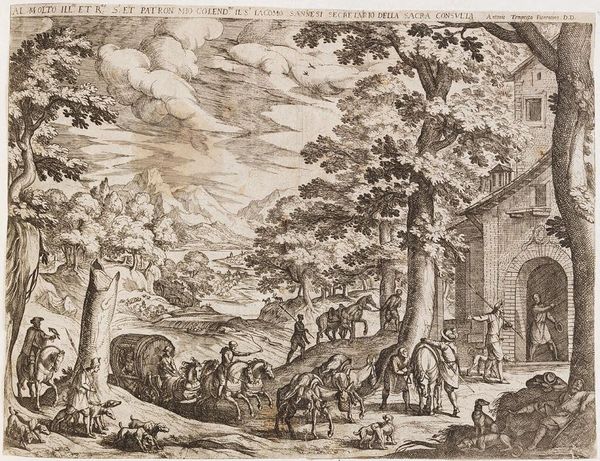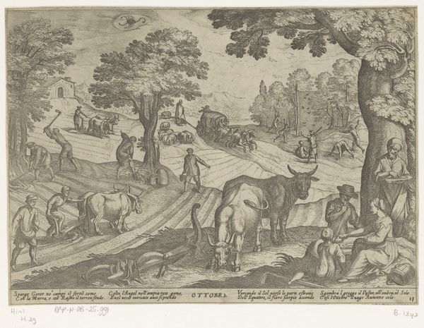 Editor: This is Antonio Tempesta's "October: Ploughing," made sometime between 1555 and 1630. It's an etching, and I'm struck by how much labor is depicted in the scene. What do you see in this piece, looking at the materials and the way it was made? Curator: The etching process itself becomes a vital part of the narrative here. Think about the labor involved in producing the plate, the repetitive action of the printing press, and how these processes reflect the agricultural labor depicted. What does this tell us about the value placed on labor, both artistic and agricultural, during this period? Editor: So, the means of production are as important as the subject itself? That's a really interesting way to look at it. I never considered that before! Curator: Precisely. By focusing on the materials and processes, we can better understand the social and economic contexts in which this artwork was created and consumed. Editor: Thanks! Now I see how the material realities are tied to the image's meaning.