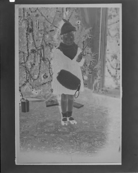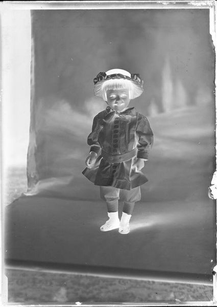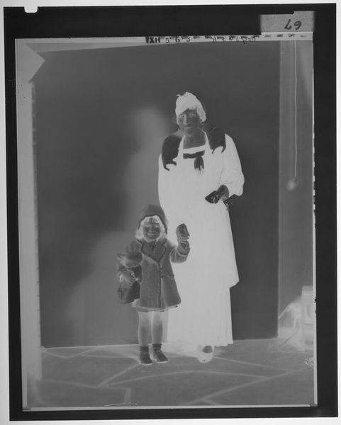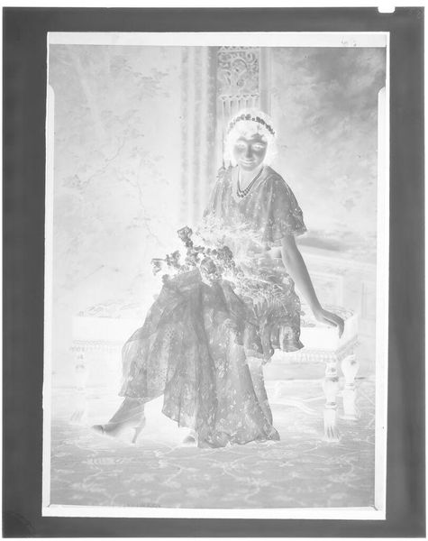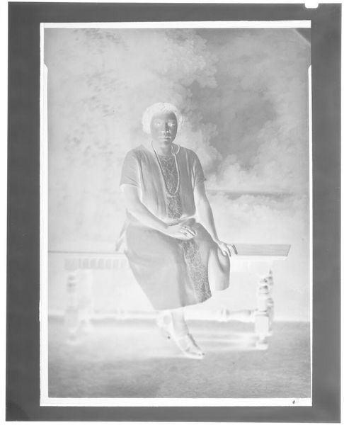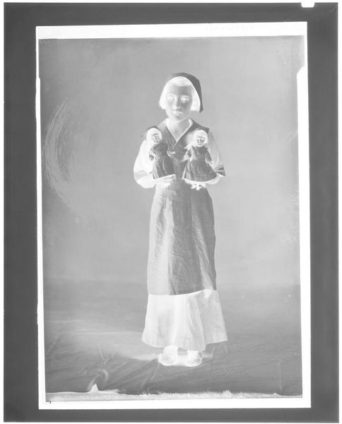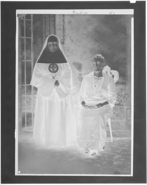 Curator: This is an intriguing photograph, titled "Untitled (girl posing in studio with bible, candle and rosary)" by John Deusing. Editor: It's arresting, isn't it? The stark contrast gives it a haunting, almost dreamlike quality. Curator: Indeed. The objects – the bible, rosary, and candle – create a tableau steeped in religious symbolism, perhaps a commentary on faith and innocence. Editor: Or a staged performance of piety? The setting, a studio, reminds us of the constructed nature of images and their power to shape cultural narratives. Curator: The girl's gaze is unnerving. Is she a participant, or a symbol manipulated by forces beyond her control? Editor: It leaves me wondering about the social role of girls at the time, the expectations placed on them, and how this image reflects or challenges those norms. Curator: A powerful piece that sparks questions about religion, representation, and the female experience. Editor: Exactly. It makes you consider the many layers of meaning imbedded in seemingly simple photographs.
