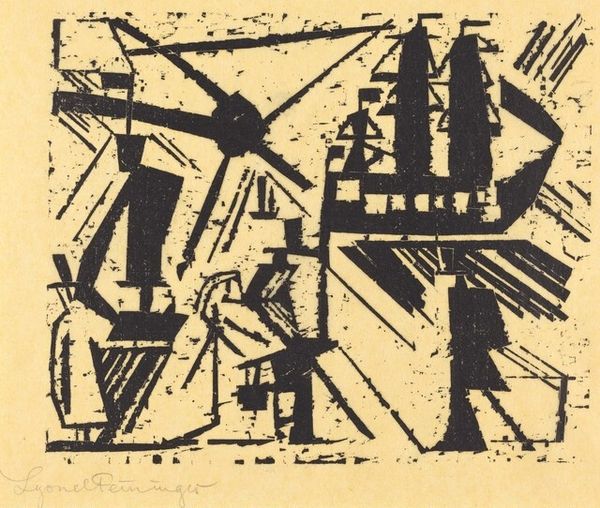 Curator: Let's turn our attention to "Composition I - Plant Forms," a woodcut print crafted by Werner Drewes in 1934. Editor: Oof, it’s intense! Like looking into a shattered kaleidoscope full of thorny secrets. The high contrast is almost violent. Curator: Drewes, aligned with German Expressionism, created this abstract piece amidst rising political tensions. Considering this context, we can view these abstracted “plant forms” as metaphors. Perhaps symbolizing resilience or the struggle to survive in a fragmented world. Editor: See, I love that! It definitely doesn't strike me as a garden party. I feel the sharp angles, the confined space. It reminds me of anxiety, almost a physical claustrophobia, you know? All those hard, dark lines fighting for space. Curator: It’s precisely this tension that defines Expressionism. Drewes was deeply influenced by the Bauhaus school; his focus on geometric forms hints at a utopian desire for order while simultaneously depicting discord. There are socio-political layers embedded within, reflective of the time. Editor: Right! The Bauhaus! Like trying to force nature into perfect little boxes, which never really works, does it? It always finds a way to burst through. I think I see that here, that struggle… or maybe I just had too much coffee. Curator: No, I believe you are touching upon a key point! It's about interpreting resistance and commentary in an abstract manner. Think about artists whose abstraction gave them an oblique form of protest that could evade censorship. Editor: Makes total sense! It’s powerful how art can say so much without spelling things out. This little piece screams even in silence. I dig it! Curator: Absolutely. It encourages us to explore the intersections of art, history, and politics—and invites consideration for diverse interpretations across time and different viewers. Editor: Yeah, now when I look at it I'm starting to see a lot more beyond the dark and light shapes... really thought-provoking piece, actually.