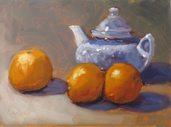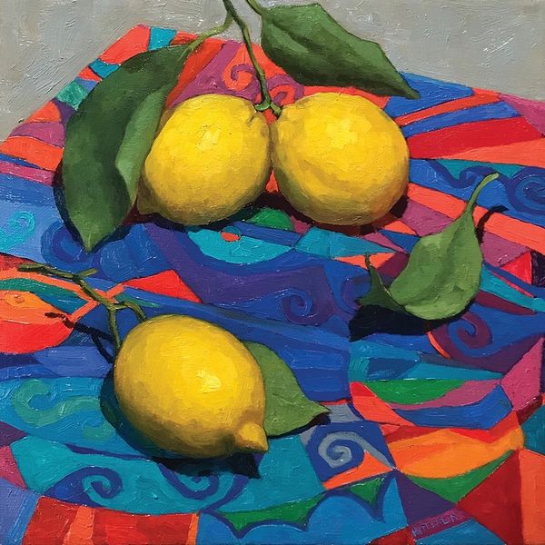 Curator: Standing before us, we have Dan Graziano’s still life, simply titled, "Two Halves". Editor: The muted background makes those oranges *pop*, doesn't it? There's almost a Caravaggio thing going on with the strong light, a dark background and the very solid way that he renders form. But not quite as dramatic. I find myself immediately wanting a bite, a sudden need for Vitamin C! Curator: Indeed! He’s managed to capture an everyday moment, yet elevates it through his focus on form and the interplay of light and shadow. The artist truly draws our attention with the carefully staged objects: a sliced orange with a knife. Note that the knife bisects the two halves as though echoing the titular "Two Halves" – creating not just division, but a sense of completion in duality. Editor: Yes, and knives often signify decision, potential action...but then coupled with the juicy halves, maybe Graziano suggests less aggression and more of a celebration of bounty and a sensory kind of readiness? I find my gaze lingering on the cut segments, expecting their sweetness any second. It is hard for me not to see this in relation to modern anxiety of consumption. Curator: Precisely. You see it as a potential, not a loss. Also observe the shadow play beneath the orange halves—those elongated shapes almost mirror the roundness above, hinting at an unseen abundance just beyond what's visible. As an iconographer, does any part stand out that really grab you? Editor: Well, there’s something elemental about the scene—a fundamental act, slicing, revealing the inner world, promising refreshment and maybe the light reflecting symbolizes hope. There's a raw simplicity which I see and celebrate here; also an almost symbolic communion with these basic gifts of the Earth: it feels grounding during times filled so often with chaotic energies. Curator: A beautiful consideration, as a symbol of "Mother Earth." It really does strike me. So simple in its execution but rich in evocative symbolism. Editor: This is absolutely it. Sometimes it's that initial clarity that opens up those complex veins we find down the road. These halves do represent this clarity in ways no full piece ever will; the knife allows all, in the end, I feel.