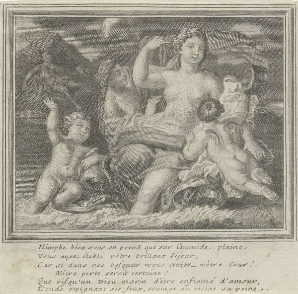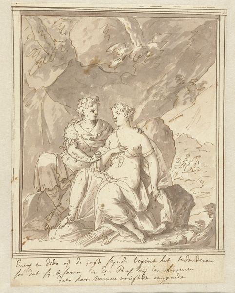 Curator: Elias van Nijmegen gives us this lovely watercolour titled "Allegory of Joy and Pleasure," likely from the late 17th or early 18th century. I find its faded tones quite charming. Editor: Mmm, charming but melancholic too, wouldn't you say? Those pastel shades, that wistful expression on the central figure’s face... There's something almost mournful in her joy. Curator: Well, it's interesting to consider the historical context. These allegorical representations were popular during the Baroque period, often commissioned by wealthy patrons to communicate virtue and status. It may speak to the ideals expected of them and perhaps unattainable in reality. Editor: Interesting perspective! I’m seeing this golden goblet being offered, perhaps symbolizing the intoxicating possibilities of life, yet she remains so poised, almost static in her posture. Meanwhile, that cherubic figure beside her peers intently into a mirror – vanity perhaps, distracting from true pleasure? Curator: That contrast certainly resonates. Note the mountains in the backdrop— barely sketched in but adding a grand scope to the piece. Van Nijmegen cleverly juxtaposes grandeur and intimate reflection, inviting the viewer to question the true sources of happiness. Or the cost to uphold the facade. Editor: The materials themselves contribute, too. Watercolour gives a light, ephemeral quality which somehow enhances the fleeting, somewhat fragile nature of "joy." Curator: Absolutely. It’s a wonderful encapsulation of the tensions inherent in pursuing fleeting pleasures. Editor: It does indeed feel like a thoughtful invitation, and this artwork continues to tickle my curiosity long after looking. Curator: It reminds me of how deeply artists explored our fragile inner emotional worlds and held a mirror up to our ambitions, back then just as now.