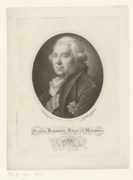 Editor: Here we have Adam von Bartsch's "Portret van Charles de Ligne" from 1780, an engraving currently held in the Rijksmuseum. It feels quite formal, a stoic profile captured within a neat oval. How do you interpret this work? Curator: Formally speaking, it presents a fascinating interplay of line and form. Notice the stark contrast between the meticulous detail within the oval, describing the sitter’s features and attire, and the smooth, almost ethereal, quality of the surrounding paper. The oval itself acts as a powerful structural device. It confines and focuses our gaze, thereby emphasizing the subject’s profile. Editor: So, the shape adds to the sense of formality? Curator: Precisely. The use of the oval – a classically-derived shape popular during the Neoclassical movement – reinforces the portrait's restrained elegance. The consistent hatching builds volume, modulating across the prince’s face to generate a subtly sculptural quality. Consider the delicate rendering of the hair; each strand contributes to a sense of controlled, yet dynamic energy. Do you see how that relates to the implied social standing? Editor: It does seem to reinforce the subject's status; like every detail is carefully considered and executed with precision, highlighting the importance of structure. It’s as if even the man's hair has to adhere to some kind of rigid structural system. Curator: An astute observation. What initially seemed to be a straightforward portrait unveils layers of technical sophistication and compositional mastery upon closer inspection. It prompts one to reflect on how form serves function in the art of portraiture. Editor: Absolutely. I hadn't initially considered how deliberately structured the image is. I appreciate that emphasis now.