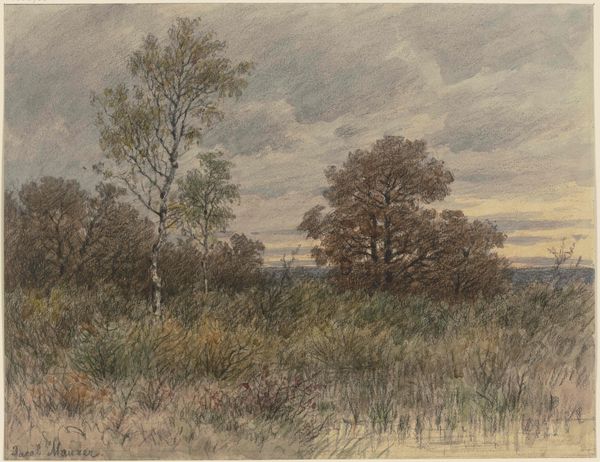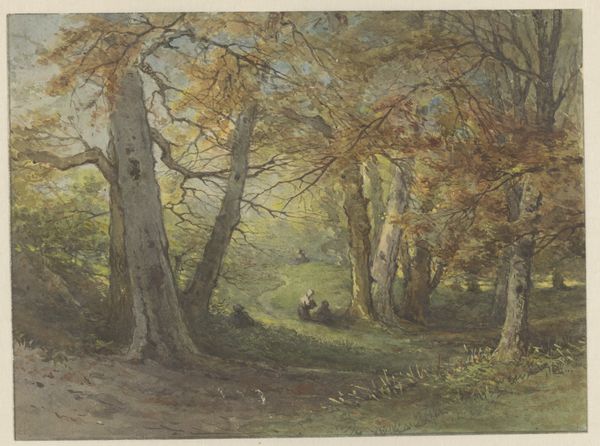 Editor: Here we have Helen Allingham's "Landscape in England" from the Harvard Art Museums. It feels very… intimate, almost like a glimpse into a private world. What strikes you most about this piece? Curator: I see this watercolor as participating in a larger artistic trend of idealizing rural English life. Consider the rise of industrialization during Allingham's time and how artists responded by romanticizing the countryside. Editor: So, this wasn't necessarily how rural life *was*, but how people *wanted* to see it? Curator: Precisely. It speaks to the politics of imagery, what stories are being told, and for whom. What do you think the artist is saying by including figures in the background? Editor: Maybe it's to show how people and nature can coexist peacefully? I never considered that art could reflect societal anxieties like that. Curator: Indeed. It's all about the cultural context, and the role art plays within it.