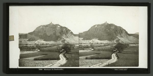 This tiny photograph shows a landscape in the Hautes-Alpes, probably made by Delizy. It's a modest panorama, and you can see it was created with careful attention to composition despite the constraints of the time. The way the light catches the mountains in the distance gives it a sort of luminosity, as if the scene were lit from within. The sepia tones create a muted, almost dreamlike quality, and the texture of the paper adds to the sense of age and history. I’m drawn to the way the artist captured the subtle nuances of light and shadow. The bare trees at the front and the winding stream lead the eye deeper into the scene, inviting us to explore the vastness of the landscape. It reminds me of the work of 19th-century landscape painters, who were similarly interested in capturing the grandeur and beauty of nature with their own techniques. Art is an ongoing conversation, don't you think?