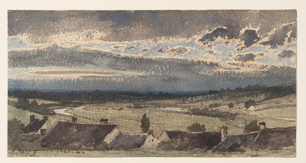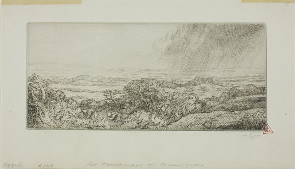 Jacobus Ludovicus Cornet created this landscape around Amersfoort using etching. The Dutch landscape, especially in the 19th century, wasn't just about pretty views. It was deeply tied to national identity. After the Napoleonic era, there was a surge in celebrating Dutch heritage, and landscapes played a big role in that. This etching captures a panoramic vista, sunbeams piercing through the clouds to illuminate the fields, and tiny figures dotting the land. There’s a romantic quality here that obscures the labor required to sustain such a landscape. Consider the view itself: high up, looking down. Who gets to have this perspective? It speaks to a certain class, one of ownership and privilege. Though it's a beautiful scene, it’s also a constructed idea of what the Netherlands should represent. This etching invites us to consider whose stories are told and whose are left out of the picture.