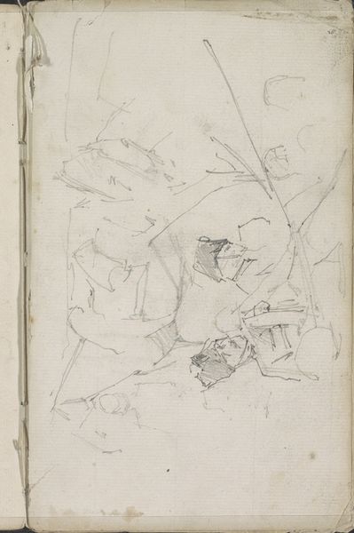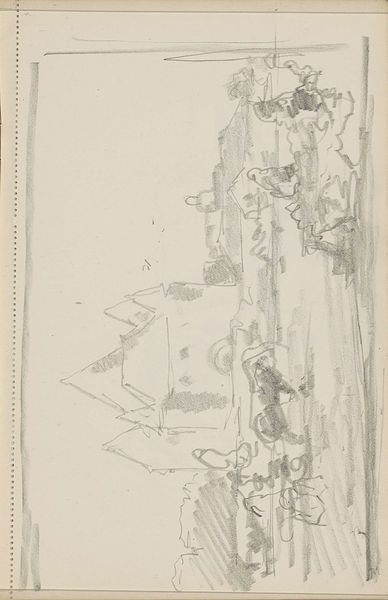 Curator: Look at this pencil sketch; it's untitled, though we often refer to it as "Weiland met koeien en een roeiboot in een sloot," placing cows and a rowboat along a ditch. It's attributed to Johannes Tavenraat and was likely made between 1862 and 1864. Editor: It has this beautiful fleeting quality. It feels like you’re peeking into someone’s private thoughts or an artist quickly trying to capture a memory before it disappears. There’s a kind of tender impermanence to it. Curator: Exactly, these personal sketches, this so-called sketchbook art, offer something rare: glimpses of an artist at their most unfiltered. It lets us see their artistic process in real-time, unfettered by the demands of a formal commission. This raw intimacy allows us access to their first attempts at form, how light and shadow informed a landscape. Editor: The lack of detail in the human figure allows a certain amount of reflection: What is the artist thinking about in relation to that character in the scenery? There is space in these images for a response. And there are hints too, these pen strokes creating cows that lean and drink in the ditch that, despite being quickly drawn, exude this sense of reality and place. Curator: Consider also that in this period, Dutch art institutions were solidifying their emphasis on realism. It could be that Tavenraat aimed to master representation, to bring something novel in his observation and execution of common rural motifs—but also one could find new expressions in a sketch unbound from any formal constraint. Editor: I think so, yes, and seeing these elements come together—the rural landscape, these gentle beasts, the lone figure—evokes this kind of serene, if somewhat melancholic, atmosphere, right? Like a fleeting moment of peace. I suppose I would call it bucolic with a wink. Curator: A fitting description! It’s funny how a humble pencil sketch can sometimes tell us more than a finished masterpiece. Editor: It’s true, isn't it? Thank you. I hadn’t thought that such light pencil work could elicit these emotions.
