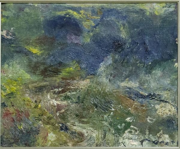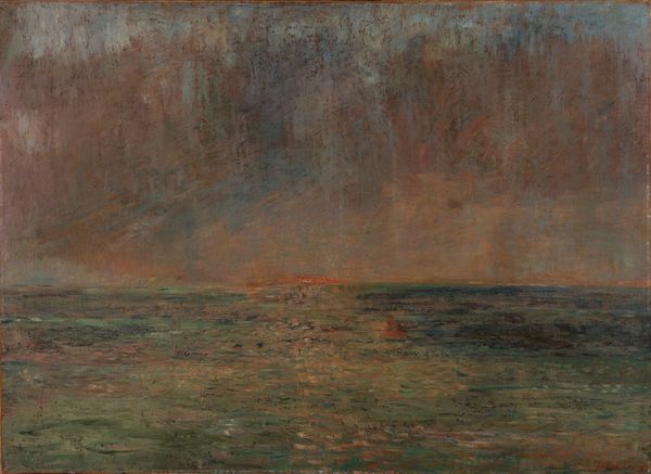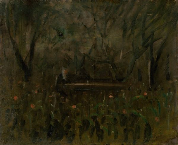 Ladislav Mednyánszky made this oil painting, Forest Interior with a Brook, sometime between the late 19th and early 20th century, using a palette that's basically greens and browns. It’s like he’s building the scene from layers of atmosphere. The texture here is really interesting, because you can see how the paint is applied in short, choppy strokes, especially in the foreground. It’s not about smooth blending but about the physicality of the paint itself. Look at that band of light cutting through the middle, like a quick slash of yellow. It’s almost violent, but it brings the whole painting to life. Mednyánszky’s later landscapes become even more abstract. You can see him pushing further into this idea of paint as its own language. It makes me think a little of Courbet, but with a more mystical, internal vibe.