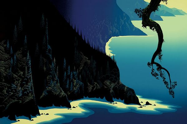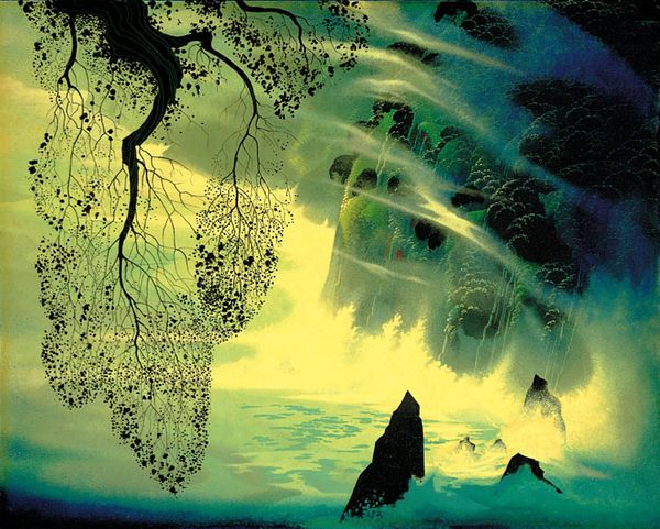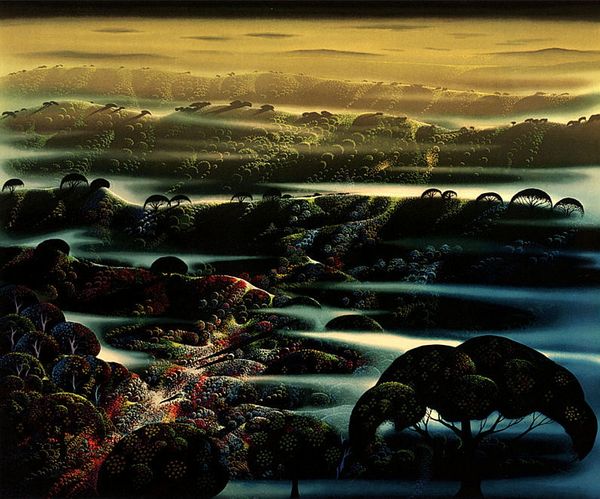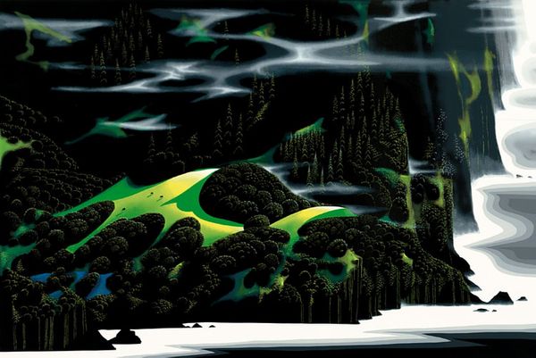 Editor: Here we have Eyvind Earle's "Coastal Magic," painted in 1993. It's an acrylic painting, and what strikes me most is the dramatic contrast between the luminous sky and the imposing, almost brooding, mountainside. It evokes a sense of awe and perhaps a bit of mystery. What do you see in this piece? Curator: It's fascinating how Earle combines elements of realism and abstraction, creating a heightened, almost theatrical landscape. This approach challenges our traditional notions of landscape painting, which, throughout art history, served varying functions from glorifying landowners to celebrating national identity. Considering the period in which Earle was creating this, the late 20th century, what role might these types of popularized landscape paintings have played? Is it pure aesthetic enjoyment, or something else? Editor: Hmm, perhaps an escape? Or maybe a way to reconnect with nature in an increasingly urbanized world. Curator: Precisely. This speaks to a specific societal need—a hunger for idealized, almost fantastical natural scenes. Notice how the "naive art" style flattens perspective and enhances decorative patterns, moving away from true representation. This "naive" approach, if adopted knowingly and marketed well, plays a vital role in shaping what's consumed by the art market. Consider also the way in which imagery can convey values or narratives, often subtle ones, reflecting broader social and cultural trends. Do you see elements of past landscape painting traditions here? Editor: Yes, in the sense that it presents an idealized view of nature. But, it’s so stylized, it feels like a dreamscape more than reality. Curator: And that is precisely the intention, to create art as both object and symbol, designed to elicit both feelings and to function decoratively. I wonder how museums will position pieces such as this as contemporary tastes continue to change? Editor: This has made me consider the power of art, particularly landscapes, to reflect and even shape our desires and understanding of the world around us. Thank you! Curator: A worthwhile reflection; the ongoing dialogue is essential.