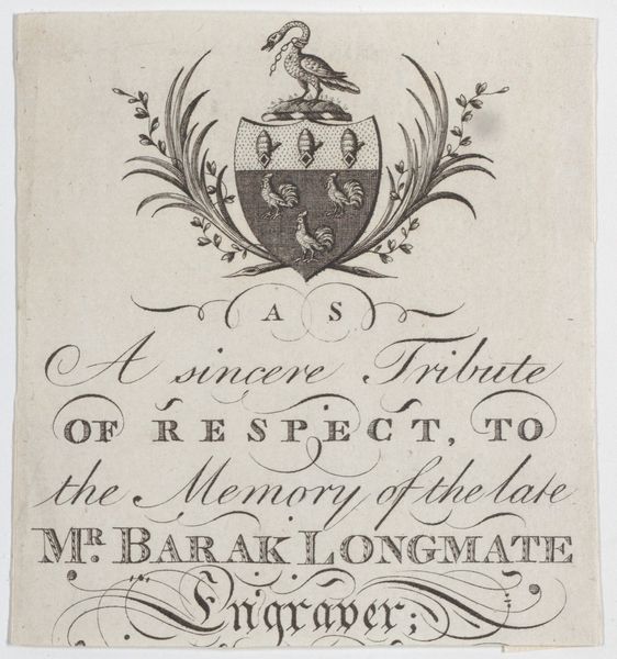 Editor: Here we have an intriguing trade card from sometime in the 1800s for William Ley, Engraver & Copper Plate Printer. It's displayed at the Metropolitan Museum of Art. The calligraphy gives it a delicate and airy feel. The various line weights give each word its own distinct presence, though they coalesce as a unit. How do you read this composition? Curator: Indeed. The graphic dynamism in this engraving resides not merely in its functionality as advertisement, but also, more profoundly, in the very texture of its lettering. Consider how the varied weights and looping flourishes interact. They serve less as transparent carriers of information and more as a study of figure and ground, solid and void, balance and counter-balance. Editor: That's interesting. It does feel like the words are arranged more for visual impact than for simply conveying a message. Are you suggesting it's more about the aesthetic form of the words than the words themselves? Curator: Precisely. Notice, for example, how the symmetry of the flourishes contrasts with the staggered alignment of the text blocks. How might one interpret such tension? Does it not challenge conventional notions of order and readability, thereby prompting a deeper reflection on the relationship between text and image, between communication and pure form? The "Engraver" becomes secondary to the _style_ of the engraving. Editor: So, the design itself is the primary subject, pushing the boundaries of what we consider to be an informational piece. This exercise has caused me to reflect on graphic art's many functions, beyond merely being informative. Curator: It's a successful study in typography that asks how such forms operate aesthetically, regardless of subject matter or medium, to construct an image.