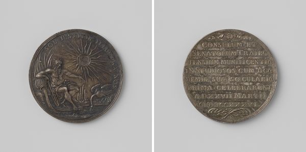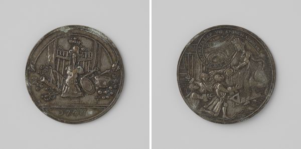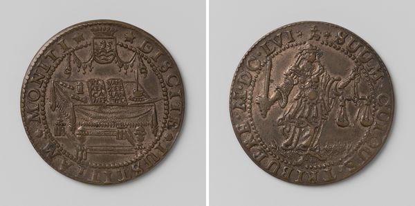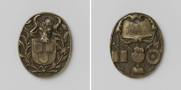 This bronze gildepenning, or guild token, was created by Francois Baillet, around the year 1600. The eye is immediately drawn to the dense arrangement of figures on one side. Three figures are positioned around a table, their forms deeply etched against a backdrop of vertical lines and a gridded floor. The composition is dense, with little negative space, creating an intimate, almost claustrophobic feel. The token's imagery, though small, speaks volumes about the social structure and economic activities of the time. The figures are not merely representations of individuals, but rather, they are signs that point to the broader guild system and its role in regulating trade and commerce. The act of "buying and cutting woolen cloth" can be read as a performance of regulated labour, which reflects a society deeply structured by class, labour, and economic exchange. Consider how the artist’s choice of bronze as a medium lends a sense of permanence and authority to the token. This materiality, combined with the dense, relief-like carving, transforms the token into more than just a marker of guild membership, but a symbol of economic power, social order and artistic expression.