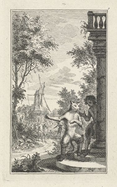 Editor: So, this engraving, "Dialoog tussen twee honden," which roughly translates to "Dialogue between two dogs," dates back to somewhere between 1700 and 1750 and is by Andries van Buysen the Elder. The piece, a pen illustration in the baroque style, just has this strange, surreal quality that I can't quite put my finger on. What do you see in it? Curator: Surreal, yes, in that very charmingly peculiar, 18th-century way. For me, it whispers of fables and veiled social commentary, almost Aesop-like but with a bite. We've got dogs, elevated to conversationalists, puzzling over letters they've stumbled upon. And isn’t it curious, this whole backstory of how these canines consumed their master's tongue and thus gained the ability to speak? Do you see any resemblance of human conditions here? Editor: I guess that would explain the inscription at the top, which basically says these are the dogs who ate their master's tongue... giving them the gift of speech and allowing them to read the letters. You can really see how they are scratching at the letter! Is it maybe saying that some in society weren’t as clever as a dog, that maybe they "bit off more than they could chew," literally? Curator: Ah, there we have it! Perhaps Van Buysen is poking fun at the aristocracy. Picture this: gossip running rampant, secrets exposed by those never intended to possess such knowledge. Did they know of Acteon turning into a stag, getting devoured by his own hounds? In any case, he’s cleverly using canine characters as proxies for societal critique. Editor: So the dogs reading isn't just funny, but it’s actually making a bigger point about who gets access to information and what they do with it! This whole piece has way more depth to it than I initially realized. Curator: Exactly! Art often invites us to scratch beneath the surface, much like those curious canines. What have we truly learned here, wouldn't you say? Editor: I think I’ve come to learn how historical context and artistic imagination combine to turn an amusing drawing into a real commentary on society. Curator: Precisely, and remember always: a dog may be man's best friend, but it can also be a sharp observer.