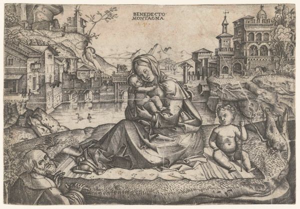 Benedetto was the son of Bartolomeo Montagna (c. 1450-1523), the leading painter in the nearby city of Vicenza. While detailed drapery and landscape also appear in his father's paintings, the composition of this engraving is influenced by Venetian art, notably the work of painter Vittore Carpaccio (c. 1460-1525/26). The shading technique with elaborate cross-hatching emulates that of Albrecht Du¨rer and Giulio Campagnola.