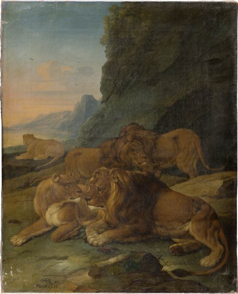 Editor: Here we have Eugène Delacroix's "Two Lions Resting," held at the Harvard Art Museums. It looks like a watercolor, and I’m struck by how detailed the lions' fur is. What can you tell me about this work? Curator: Consider the materials Delacroix chose: watercolor on paper. How does that medium itself relate to the subject matter of untamed animals? Was watercolor considered a 'lesser' medium then, and if so, what statement might Delacroix be making by depicting powerful creatures with it? Editor: I never thought about the material that way. So, it’s about elevating the medium itself? Curator: It's about interrogating the social hierarchy around art making, the work involved, and the value ascribed to different forms of labor, both artistic and perhaps even the labor of the animals themselves. What does it mean to depict them "resting"? Editor: It’s made me think differently about how artists and society value the materials used in art.