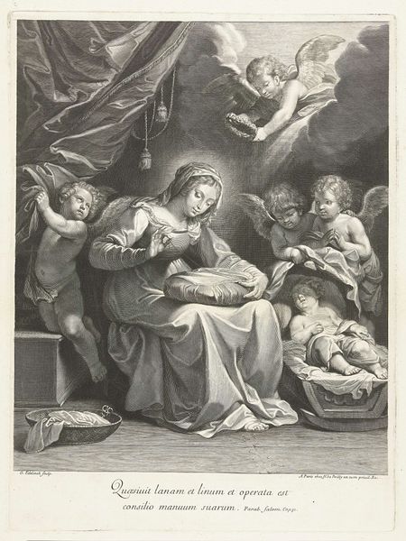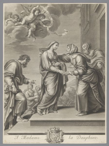 Editor: This is Jean Louis Roullet's "Visitation," done sometime in the late 17th century. It depicts Mary and Elizabeth meeting, and the way they reach for each other is really striking. What symbols jump out to you in this piece? Curator: Notice how the cherubs unfurl a banner reading "Ecce Agnus Dei," or "Behold, the Lamb of God." This references Christ's future sacrifice, foreshadowing themes of redemption even in this tender encounter. Does that layering of symbolism resonate with you? Editor: Definitely. It's like the image is speaking on multiple levels. Thanks, that’s a great insight. Curator: My pleasure. Reflecting on these symbols enhances our understanding and allows the artwork to speak across centuries.