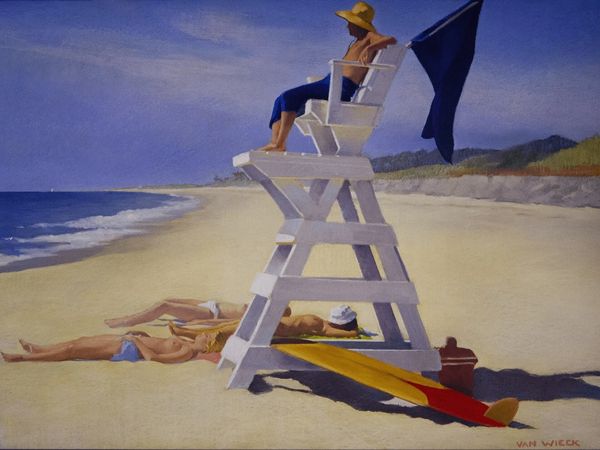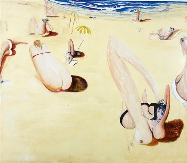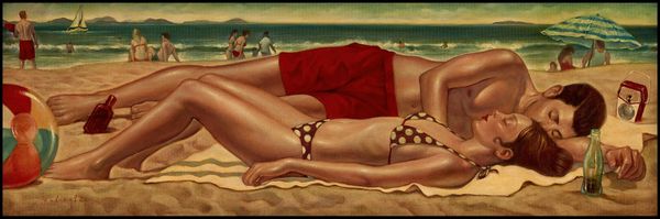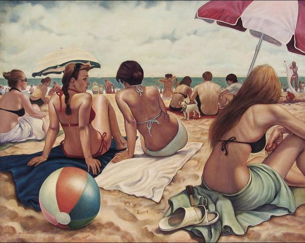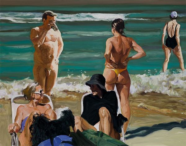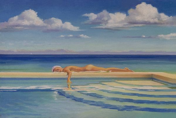 Curator: Nigel Van Wieck’s "Sea Breeze" presents us with a captivating scene. I'm immediately drawn in by the tranquil atmosphere it evokes. Editor: Yes, at first glance it feels serene, even idyllic, but there's something unsettling in its staging, isn't there? Curator: Unsettling how? I see the familiar iconography of leisure – the reclining nude, the striped beach umbrella, the gentle lapping of turquoise water… these are images heavily laden with cultural associations of carefree escape and sensuality. Editor: Precisely, but the male figure wading ashore, seemingly nude himself, carrying some sort of long object– perhaps a fishing spear – is unsettling. It disturbs the hyper-feminized presentation with implications of labor, conquest, a predatory masculine element looming. Curator: I perceive it differently. The fisherman becomes a kind of watchful protector, or a solitary figure communing with nature. Van Wieck has set the scene in his classic Plein-air style, capturing an instantaneous moment of the coast with immediacy. Oil paint and some traces of acrylic, right? The artist has certainly chosen his palette to portray a traditional holiday atmosphere, if the viewer is accustomed to this environment. Editor: "Communing" feels generous; "intrusive" springs to mind. The painting speaks, perhaps unintentionally, to issues of gendered spaces and the ever-present male gaze, even on supposedly 'safe' beaches. Curator: Aren't you perhaps reading too much contemporary anxieties into a painting that celebrates the enduring symbols of relaxation? Or perhaps this juxtaposition reflects our complex relationship with leisure, where enjoyment and a sense of underlying tension often coexist. The fisherman, although not explicitly threatening, breaks the dream of careless enjoyment, disrupting the symbol, even reversing it. Editor: Perhaps. But it is in its capacity to generate that ambiguity that this work has meaning. Art's ability to challenge, to make the familiar unfamiliar and interrogate existing social norms gives us a glimpse into historical perception and lived reality. Curator: I appreciate you for bringing the historical, theoretical understanding into a piece that stands on its own merits to trigger symbolic reflection. Editor: Likewise. Spotlighting how historical symbolism continues to evolve through current theory, enriches our understanding, both separately and together.