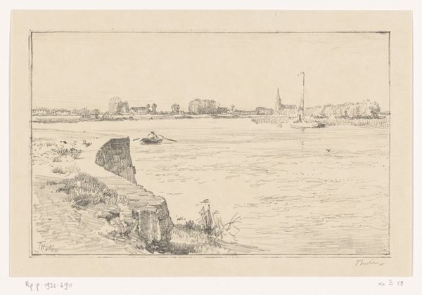 Editor: So, this etching is called "Zeilboot op een meer," or "Sailboat on a Lake," by Maurits van der Valk, dating anywhere from 1867 to 1922. I’m immediately drawn to the detail in the clouds and the water’s reflections, a bit dreamlike. What do you see in this piece, especially considering its time period? Curator: The artwork is more than just a pleasant scene; it invites us to consider the Netherlands' complex relationship with its waterways. Think about the historical struggle for land reclamation and the constant negotiation between the Dutch and the sea. This image, made accessible through printmaking, might symbolize ideas about national identity intertwined with land and water. Who had access to images like these, and what messages did it communicate about Dutch resilience and control over nature? Editor: That's a perspective I hadn't considered. The sailboat, then, could be a symbol of progress or even... control? Curator: Precisely! And it encourages a dialogue about whose narratives are prioritised. How might representations like these have contributed to a shared cultural understanding? What about those whose lives and livelihoods were directly affected by these projects of land reclamation - were their stories represented or erased in these idealized images? The date range too--the etching could have been produced and circulated across the industrial revolution, a time when debates around humankind's relationship to its enviroment reached a fever pitch. Editor: So, it’s not just a quiet scene; it's part of a larger conversation. I never would have gotten that from simply looking at the sailboat. Thanks! Curator: Absolutely. Examining art this way brings it to life. Thinking about the politics enmeshed in such scenes really does create richer dialogue.