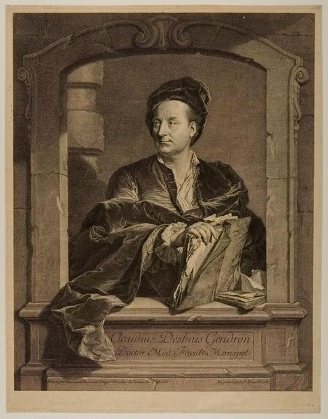 Editor: So, this is a portrait of Fridericus Benedictus Oertel by Georg Friedrich Schmidt, currently at the Harvard Art Museums. It has an interesting allegorical composition and I'm curious about the cherubic figure. What is your interpretation of this work, especially its cultural context? Curator: Considering Schmidt's time, portraits of this nature were often instruments of power. The inclusion of the cherub, and even the architectural frame, all contribute to Oertel's construction of an image: What do these symbols communicate about status, gender, and the role of knowledge in shaping societal hierarchies? Editor: That’s fascinating! I hadn't thought about the architectural framing as part of that power dynamic. Curator: Exactly. We must examine how art participates in these power dynamics to truly understand its impact and meaning in history. Editor: I’ll definitely be looking at portraits differently now. Thanks!