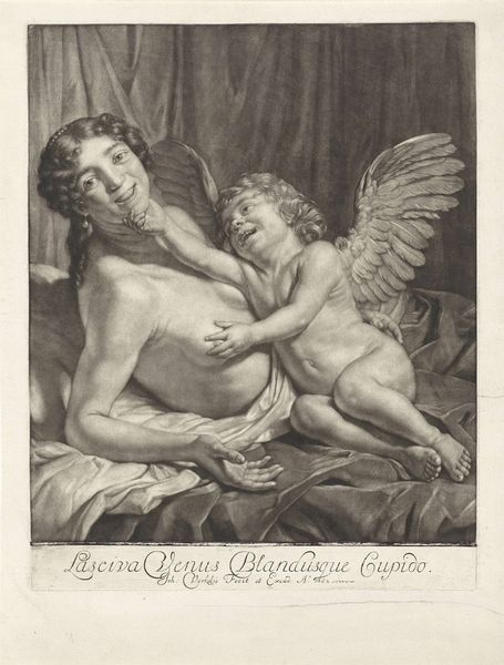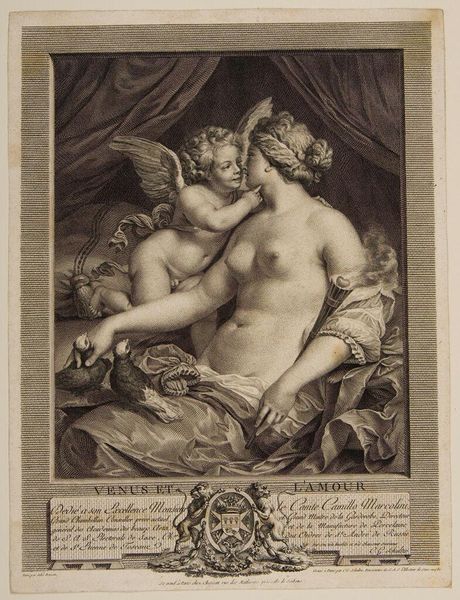 Curator: Carlo Antonio Porporati’s “Watch Out” presents us with a tender Cupid, finger to his lips, seemingly warning us of something unseen. Editor: The composition is striking, the oval format framing the figure perfectly. The textures, especially the drapery and the feathered wing, are beautifully rendered. Curator: The artist, active during a period of shifting societal structures, cleverly positions Cupid between classical allegory and everyday life; he’s both divine and humanized. Notice the lizard at the base, a symbol rife with social meaning depending on period and place. Editor: It’s the contrast between the softness of Cupid’s form and the sharpness of the engraving that really grabs my attention. Curator: Considering the context of printmaking, “Watch Out” was likely disseminated widely, engaging a broad audience in questions of love, desire, and warning. Editor: A piece that holds you in its visual thrall, its quiet tones belying a more complex symbolic narrative.