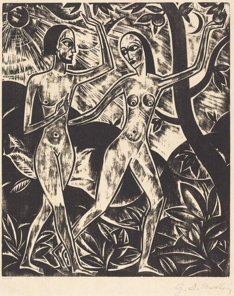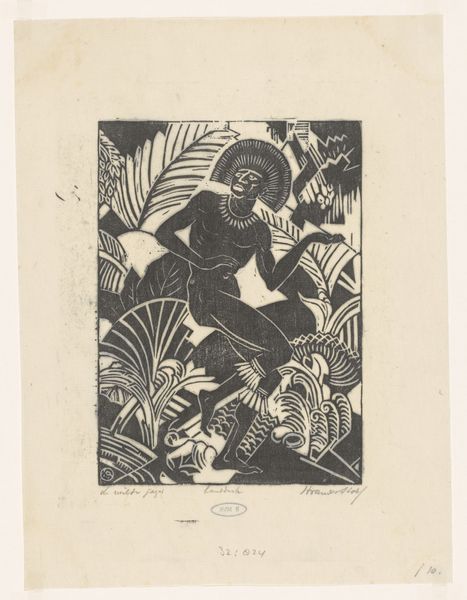James Lesesne Wells made this woodcut print, titled "The Burning Bush," and the date is unknown. The density of the black lines carves out space, creating a kind of depth that is visually arresting. The dramatic contrast between light and dark feels raw, elemental, and the texture! You can almost feel the grain of the wood, its resistance, its very being. Look closely at Moses' beard. See how Wells uses tight, parallel lines to define its shape and texture? It’s almost sculptural, giving the figure a tangible presence. The way the light emanates from above, those vertical strokes, it’s as if the divine is actively intervening, not just illuminating but participating in the scene. Wells reminds me of artists like Emil Nolde, who understood the spiritual dimension of artmaking, the way a simple mark can evoke a whole world of feeling and meaning. Ultimately, this print resonates because it embraces the ambiguity of faith, the unknowable essence that makes us human.