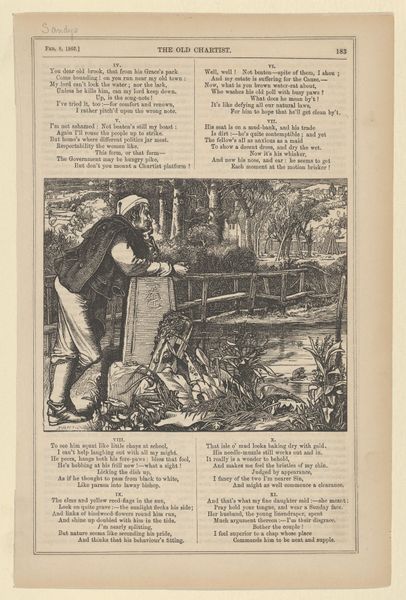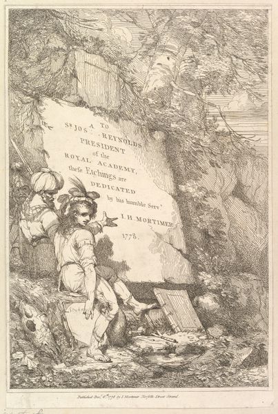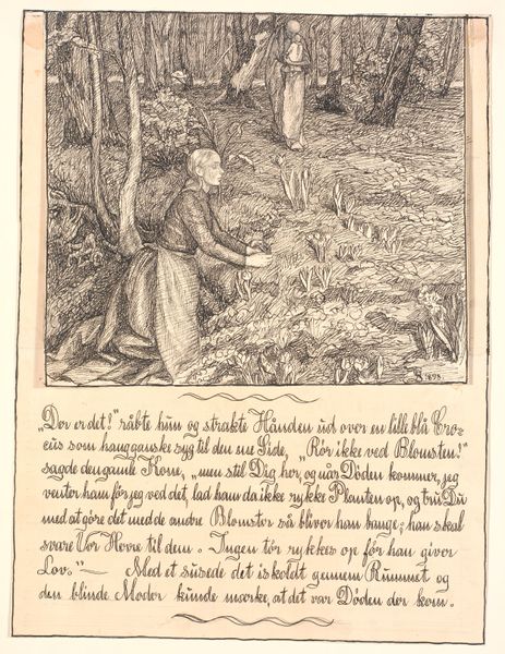 Curator: Look at this engraving, "Liden Gunver," dating back to sometime between 1829 and 1899, attributed to H.P. Hansen. It’s currently held at the SMK, Statens Museum for Kunst. It has such a powerful, mythical air about it. Editor: My first thought is—it's both tender and terrifying. The stark lines of the engraving create this intense drama, but the figures have a surprising vulnerability. The woman's gesture... Is she saving him, or being pulled under? Curator: The artwork pulls strongly from Romanticism. The focus is clearly on evoking emotion through both its style and narrative. The use of line work, I think, emphasizes a feeling of something otherworldly about the landscape. The artist wanted to tell a story, clearly, and he uses figuration to connect with viewers. Editor: Yes, the landscape really contributes to that. It's harsh but compelling. What is so remarkable is how the inscription is interwoven within the image. But I wonder about the "false men" mentioned within it. Were they a historical threat, a political metaphor, or simply a way to deepen the fairy tale Hansen’s crafting here? Curator: That's exactly the question! This piece places itself firmly within history painting, but also invites us into the depths of local stories, myths, and their impact on society, then and now. Romanticism also dealt with themes of darkness... perhaps an artist from the 19th century wants you to know to watch out for evil lurking just beneath the surface. Editor: Thinking about how this piece has circulated… as a print, its accessibility is something to consider. Romantic ideals democratized in little, haunting images— distributed from Copenhagen across Europe, perhaps? It becomes an interesting question about what art gets seen, and by whom, within the political frameworks of art. Curator: Absolutely! It brings up larger conversations, which, when art does *that*, is a certain measure of its value. "Liden Gunver" leaves you thinking long after you’ve turned away, wondering at what the images say in total. Editor: Agreed. A small print, but epic in its implications. A reminder that even the quietest artworks can spark loud debates about culture and history.