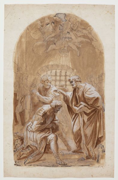 Curator: Welcome. We're standing before "Jesusbarnet svævende på en sky"—"Infant Jesus Floating on a Cloud"—a Baroque drawing from circa 1641 to 1711, its creator, sadly, unknown. The piece is ink and watercolor on paper, a sepia-toned devotional scene. Editor: It feels quite ethereal. The monochromatic tones lend it an antique quality, almost faded, while the cherubic figures clustered around the infant Jesus evoke a sense of divine innocence and purity. There's a contemplative mood about it. Curator: The artist, though anonymous, clearly situated themself within established visual traditions. Consider the visual tropes: the halo around the child's head, the angels—hallmarks of religious iconography utilized throughout art history to convey holiness. It reflects the Church's powerful influence on art production. Editor: And the inclusion of the monk – possibly St. Francis due to the simple robe – really positions the Church and its devotion at the very heart of the image. There is a dialogue, both spiritual and corporeal, going on, that the artist makes accessible to the viewer. It emphasizes faith's performative nature, of being something lived, observed. Curator: Exactly. Images like these weren't simply aesthetic objects; they were didactic tools. They reinforced the doctrines of the Church, instructing viewers about faith, humility, and divine power. Consider the socioeconomic climate: literacy was limited. The artworks delivered visual narratives accessible to everyone, regardless of social standing. Editor: You're right. While from a contemporary perspective, it evokes notions of the ideal, what one *should* aspire to in their personal beliefs, I see a more coercive subtext within that narrative. I also can't help wondering how it feels viewing art so inherently linked to European imperialism. Is faith in that part of history irretrievably altered, given its brutal legacies? Curator: These are essential questions to grapple with when considering works like this. It is an entry point for discussing historical context and reception, helping visitors interpret it in all its complexities. Editor: I agree. Thanks to art and its capacity to connect us across time, this compels us to consider these issues more urgently. Curator: It does indeed; an artwork serving both faith and the crucial discourse necessary to keep history relevant in the present day.