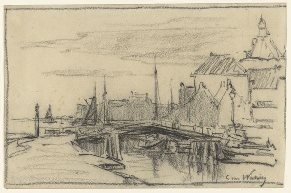 Editor: Here we have Carel Nicolaas Storm van 's-Gravesande's "Gezicht op de Vliet in Leidschendam," an etching made sometime between 1851 and 1902. It depicts a tranquil cityscape along a waterway. It feels almost dreamlike because of its soft, delicate lines and monochromatic palette. What elements stand out to you? Curator: Primarily, the artist’s sophisticated use of line. Notice how the varying densities and directions of the etched lines not only define the forms, such as the church and the buildings lining the Vliet, but also articulate the atmospheric conditions. Consider the sky. Note the contrast in line density, achieving a compelling spatial recession. What visual techniques do you observe in rendering the water's surface? Editor: I see that the lines used to depict the water are mostly horizontal and a bit wavy, reflecting the sky. But, overall, what purpose does this meticulous rendering of details serve the artwork? Curator: Indeed, the water's surface showcases Storm van 's-Gravesande's mastery of etching. However, the formal purpose of such articulation is not merely descriptive. The intricate network of lines establishes a visual rhythm that leads the eye through the composition. The steeple draws our gaze vertically and horizontally across the watery reflections. It becomes evident that the subject matter, while seemingly representational, is ultimately a vehicle for exploring formal relationships: line, tone, and composition. Editor: I see what you mean. I was so caught up in what was depicted I had not considered that! What do you think this teaches us? Curator: That the formal elements within a work speak just as loudly as the historical ones; examining their combination, tension, and careful placement lets us start conversations on the meaning of art in the simplest and grandest sense.