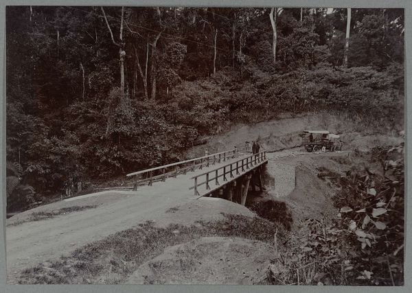 This photograph, "Weg en brug over de Woih ni Koelos," was made by an anonymous artist. It's a real landscape, but the textures feel built, almost modeled. The road curves like a brushstroke, a big, fat line you might make with a house painter's brush. Then there’s the bridge, a rigid grid imposed on the organic chaos of the forest, and those two tiny figures crossing, dwarfed by the scale of the trees. There's an odd patch of light, a kind of bleach effect that makes it look artificial, like a dodge or burn in the darkroom gone wrong. That imperfection brings a human element to the work. It's like a glitch in the matrix, reminding us that seeing is always a constructed act, a collaboration between the eye and the world. It reminds me a little of some of the Hudson River School painters, but more like a fever dream. A different take on the same themes. And that’s what art is all about, right? An ongoing conversation, a riff on what came before.