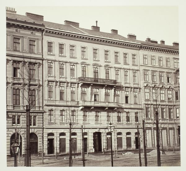 Curator: Here we have an image titled "Berggasse No. 16, Palais des Grafen Georg Festetics de Tolna," a photograph dating back to the 1860s. Editor: My initial impression is one of stark formality, even austerity. It’s a wall of windows and strict architectural lines, rendered in monochrome. Curator: Right. This silver print captures a very specific slice of 19th-century Vienna, the aristocratic palace on Berggasse 16. Think about the burgeoning of photography in this era, and how it allowed for documenting structures and urban spaces with unprecedented realism. It offered an almost objective portrayal. Editor: "Objective" is a key word here. I am not so sure about this objectiveness, especially given that buildings are never neutral. Palaces such as this were powerful symbols of wealth and privilege, silently conveying power dynamics embedded in the city’s social structure. Even the act of choosing what to frame—what to show and not show—speaks volumes. Curator: True. However, photography offered a different viewing experience to, say, painting, even though similar visual compositions were clearly in play, given photography’s early associations with landscape painting. Editor: It's a fascinating tension—that drive towards a purportedly objective representation versus the inherent socio-political dimensions imbedded in urban photography. And I’m curious: what does Berggasse 16 signify to Viennese collective memory? Was this just another aristocratic address, or something more meaningful? Curator: It is most famous, in a rather unexpected historical twist, as the address where Sigmund Freud lived and had his office for almost 50 years! His apartment was on the first floor and his consulting rooms on the bel étage, or second floor. While the building may stand as an architectural representation of aristocratic power, its historical identity today is far more powerfully defined by psychoanalysis, a symbolic power which undoubtedly subverts the intent for those who built it. Editor: Fascinating! So, the meaning of the place has radically shifted across time, acquiring an entirely new layer of socio-cultural relevance related to psychological exploration and challenging societal norms! That complicates my initial read considerably! Curator: It certainly does, showcasing the evolution of spaces and their symbolic significance. Editor: What seemed to me an unyielding, stark statement has transformed into something with far greater depth. Curator: Indeed. Visual austerity coexisting with intellectual and therapeutic dynamism! A curious duality!