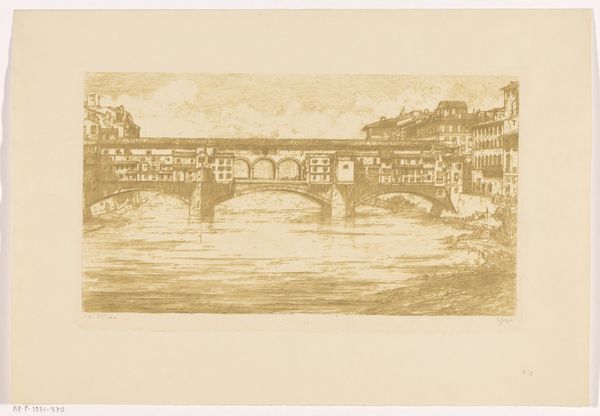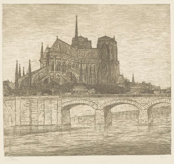 Curator: This etching on paper by Donald Shaw MacLaughlan, titled "Le Pont Neuf, Paris," dates back to 1907 and gives a timeless view of Parisian life. Editor: It's stunning! I am struck by how it manages to feel both solid and dreamlike, due to the delicate lines. It is as if the city itself is a memory fading at the edges. Curator: It does capture that hazy, romantic idea of Paris. MacLaughlan was an American artist who made his name in Europe, particularly with prints like these. Consider that his popularity came as urban centers began asserting political and economic power— his prints, mass-produced and relatively inexpensive, captured the vibrancy of modern urbanity for public consumption. Editor: Absolutely, it is no accident that the scene captures Le Pont Neuf, rich in symbolism as the oldest bridge in Paris. Notice the ways in which the image of the bridge extends beyond merely architectural importance; it conveys resilience, permanence, and serves as a steadfast figure in the constant change around it. That image continues to speak to Parisians and the city's long history, even today. Curator: Indeed. Pont Neuf was revolutionary in its time, constructed under the reign of Henry III. It lacked the houses which were typical of bridges at the time, thereby allowing an unobstructed view of the Seine, so of course artists would eventually embrace it as a central subject. Editor: Look closely, and you see a collection of archetypal city structures behind it. In choosing this subject, the artist invokes a feeling of continuity through a layering of symbols: flowing river, solid bridge, classic architecture. There’s something reassuring in this scene, despite its depiction being in monochrome, isn't there? Curator: Definitely. And consider how that feeling permeated society: prints of scenes like this played a key role in shaping the collective idea of Paris itself. They became a valuable cultural commodity, shaping public understanding and memory through selective romanticization. Editor: That is really well captured in MacLaughlan’s etching! Thanks to his focus on enduring symbols, we’re still finding new meaning in the city’s architecture. Curator: Yes. An artist’s decision of where to put their focus has long historical ripples.