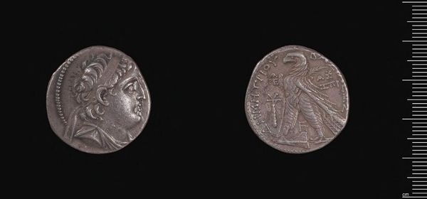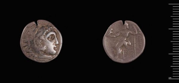 Curator: Here we have a Drachm of Alexander the Great, a silver coin likely minted in Asia Minor. Editor: Its circular form, aged patina, and diminutive scale belie the immense power it once represented. Curator: Absolutely. Consider the socio-political implications: this coin, though small, symbolized Alexander’s vast empire, disseminating his image and authority across conquered lands. Editor: The craftsmanship too is remarkable; observe the idealized profile, the precise rendering of the laurel wreath—symbols of victory and divine favor. Curator: And let's not forget the impact on trade and cultural exchange. The widespread use of this drachm facilitated economic activity, fostering interactions between diverse populations. Editor: Yes, but the image, the artistry itself, presents a clear message about idealized power. The visual language is masterful. Curator: It’s a fascinating intersection of economics, propaganda, and identity, isn't it? A tangible link to a pivotal moment in history. Editor: Indeed, a small object carrying such potent formal and historical weight.
