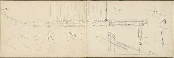 Curator: Carel Adolph Lion Cachet created this pen and pencil drawing, “Kerktoren en interieurontwerpen,” around 1905. Currently, it resides within the Rijksmuseum's collection. Editor: My initial impression is that these are exploratory sketches—ideas captured in the moment. The thin lines feel tentative, giving it an intimate, almost secretive quality, like peeking into the artist’s notebook. Curator: Indeed. Cachet was known for his role in the Dutch Art Nouveau movement, and his work extended into areas like graphic design and textile art. This sketch offers insights into his process and architectural interests, perhaps for a larger, unrealized commission. It shows the merging of external landscapes and internal designs. How do you interpret this interplay, conceptually? Editor: I see a reflection of early 20th-century tensions between tradition and modernity. The church tower symbolizes established power and social structures, while the interior sketches hint at evolving aesthetic values—a push for innovative and inclusive spaces. I'm thinking about how buildings embody ideology. Curator: That’s astute. Considering the social role of churches then and Cachet’s aesthetic leanings, this duality is indeed telling. He worked at a time when debates around the function of public spaces and their ability to uplift or exclude were intensifying, right? The art world grappled with how design could reflect societal reforms. Editor: Precisely. There’s a fascinating tension in using such a traditional subject, a church, as a jumping-off point for exploring innovative design. Was he subverting the status quo, or attempting to reconcile tradition with progress? The sketches feel open-ended, resisting a definitive answer, in that way becoming more powerful for the observer. Curator: These sketches grant a privileged, vulnerable glimpse into the development of an artist's design process. Editor: This exercise has reminded me that we all should challenge the status quo and not be afraid of tension!