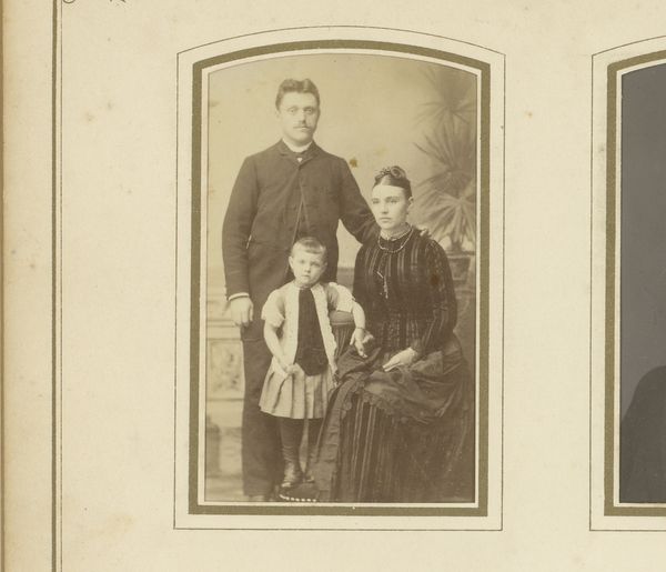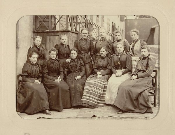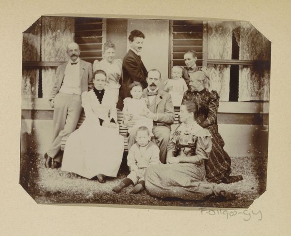 Editor: This is "Familieportret van de familie van Elst -den Bant" by Wilhelm Kuntzemüller, created sometime between 1876 and 1918. It’s a sepia-toned photograph of a large family. The lighting and stiff poses give it a somewhat solemn air. What catches your eye when you look at it? Curator: The careful arrangement of the figures speaks volumes. Note how the father figure and the seated women form a base, anchoring the family's social structure. What stories do their clothes tell, the weight and cut of them? Think about the symbolism inherent in the accessories—the cane held by the boy, a suggestion of future authority, and the woman's hat, indicating status and perhaps travel. What emotional connection can you decipher from their stance? Editor: I see what you mean. The placement does seem very deliberate, almost staged. How does that staging affect our reading of the image as a portrayal of this family? Curator: Indeed. And the staging is important precisely because this photograph is, in essence, creating an artifact for future generations to consider. The cultural memory being constructed here is one of stability, propriety, and lineage. Are they successful at conveying it or is the formality strangely alienating for today's viewers? Does the formality make us focus more closely on their features? Editor: It's interesting to think of it as actively creating memory. I guess photographs do that, don't they? Even seemingly casual ones. Curator: Precisely. Even seemingly so. But those choices - of composition, of clothing, of gesture, build a cultural narrative whether we acknowledge it or not. Look at other photographs from the same era - do you notice any recurring themes or symbols? It helps to start building context and making inferences. Editor: I'll definitely keep that in mind. Thanks, that’s really fascinating to consider. Curator: It's an endless quest. This single image is part of a visual continuum and cultural conversation.
