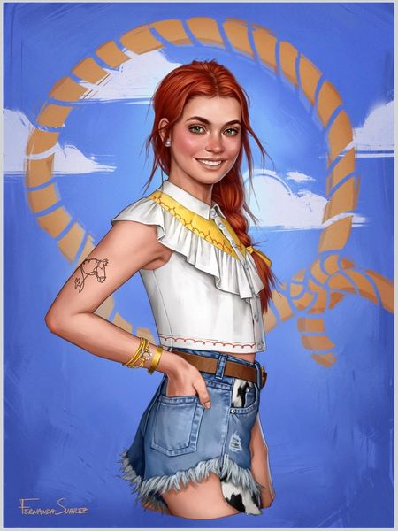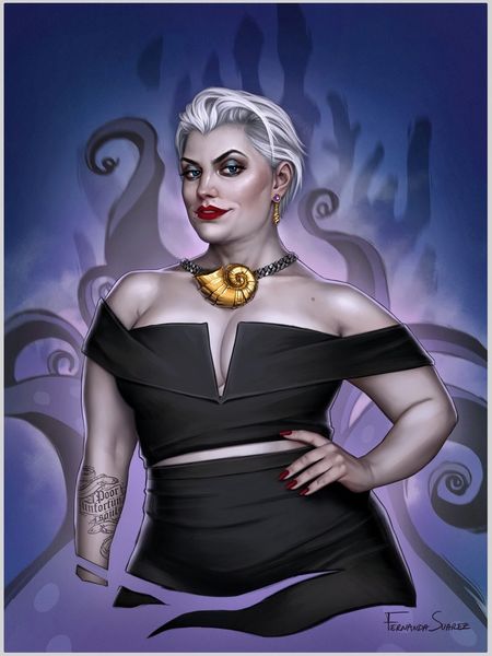 Curator: Let's discuss "Elsa" by Fernanda Suarez. This work utilizes mixed media, presenting a fresh take on a familiar character through a portrait. Editor: Immediately, I'm struck by the contrast. It’s both familiar and jarring. The digital art rendering clashes pleasantly with a very tangible and present gaze, quite compelling. Curator: The artist seems to play on our pre-conceived notions of the Disney princess, inserting her into contemporary visual culture. Note the modern clothing against the backdrop of what seems a classic magical setting. Editor: Exactly. It raises questions about value—what makes “fine art” versus character design? The materiality hints at acrylics and perhaps digital manipulation; It blurs those lines between the hand-made and the mass-produced, especially how consumer products influence contemporary representation. Curator: And it really engages with the politics of imagery we see circulated through these modern interpretations. How Disney itself uses "princess" archetypes. Suarez is engaging and perhaps subverting the notion of feminine power, right? Editor: Precisely. The intense, modern makeup and the subtle but determined look challenge any simple reading of "princess." Also consider her method; the distribution of art, particularly portraiture through social media. This democratization reframes both accessibility and authority in art production. Curator: Absolutely, there’s something about her direct stare. What the impact is on viewers confronting a celebrity icon represented in this hyper-real, very tangible style? Does that open possibilities of critique? Editor: Or celebration. Depends where the individual’s point-of-view. But that tactility, realness within the frame pushes one towards a tactile appreciation of the skill and a reflection on how we encounter our icons, our representations today. A nice tension and complexity. Curator: Yes, something very contemporary about how Suarez manipulates this cultural icon to spark a dialogue about art and how imagery is re-framed in our lives. Editor: Indeed. It is quite refreshing to observe a dialogue between popular character depictions and discussions of production, craftsmanship, and ultimately the evolving place of representation in visual culture.