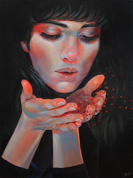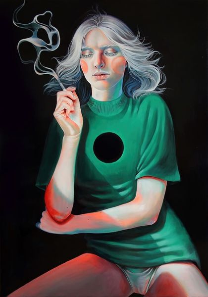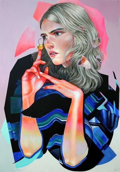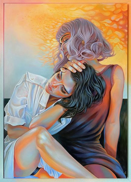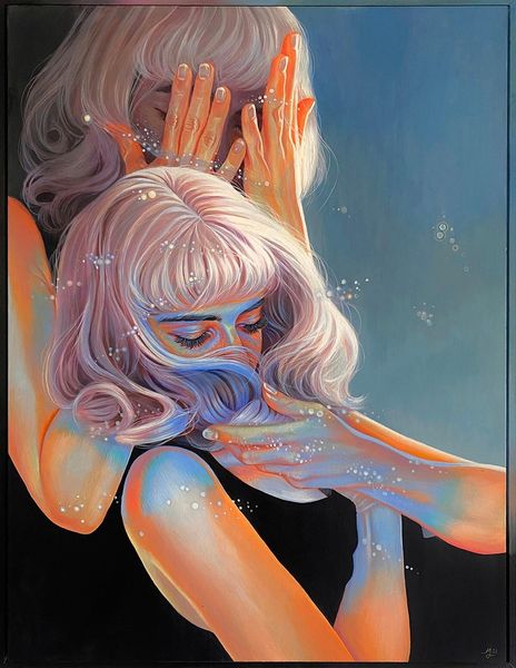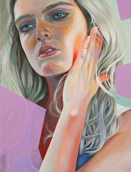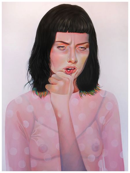 Martine Johanna created this work, called Momentum, during the 21st century. Her art exists in a unique space, reflecting the tension between lived experience and idealized image, particularly as it pertains to women. The subject's face is framed by her hands as she looks down, eyes closed; one might interpret this as a gesture of introspection or perhaps even shielding herself from the world. Johanna’s work often examines the multifaceted nature of feminine identity. She develops alternative narratives, diverging from traditional representations of women. She explores themes such as vulnerability and strength. The pale color palette, with its soft pinks and whites, enhances the dreamlike quality of the piece, inviting contemplation on the transient nature of emotions and the ever-shifting states of being. Momentum captures a deeply personal moment. It encourages a broader dialogue about identity, representation, and the emotional landscapes we all navigate.