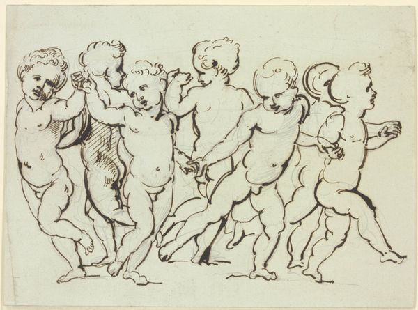 Editor: Here we have "Two Boys with Two Satyrs," a study for "The Triumph of Venus" by the Workshop of Carlo Cignani. It's a lively sketch, full of movement, but I'm curious about the figures themselves. What do you see in this piece? Curator: The satyrs, with their goat-like features, are fascinating. They represent the wild, untamed aspects of nature, contrasting with the boys' innocence. Consider how this tension reflects a deeper cultural memory, perhaps a longing for a lost pastoral world. Editor: So the image evokes a sense of nostalgia? Curator: Indeed, and it plays with the dichotomy between civilization and nature. The sketch itself is a symbolic space where these opposing forces meet. What does that make you consider about the human experience? Editor: I'm struck by how such a simple drawing can hold such complex ideas. Curator: Precisely! Visual symbols can unlock cultural memory, prompting us to reflect on our place in the world and time.