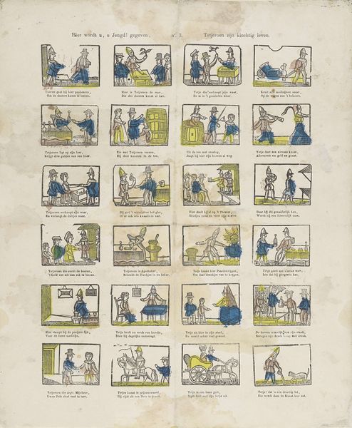 This undated, small print by weduwe Aldag, now at the Rijksmuseum, presents a series of vignettes, each neatly framed in a grid, colored in muted yellows and blues that lend a quaint, dreamlike quality. The composition, structured as a collection of discrete narratives, reflects an interest in cataloging and ordering experience. Each scene, though simple, is rendered with a linear precision that speaks to broader questions of representation and legibility. This print invites us to consider how the formal structure of image-making can function as a kind of visual taxonomy. The artist's deployment of line is particularly striking. It not only defines the forms within each vignette but also delineates the boundaries between them, emphasizing the constructed nature of these images. This use of line and boundary destabilizes our perception, urging us to question the limits of representation.