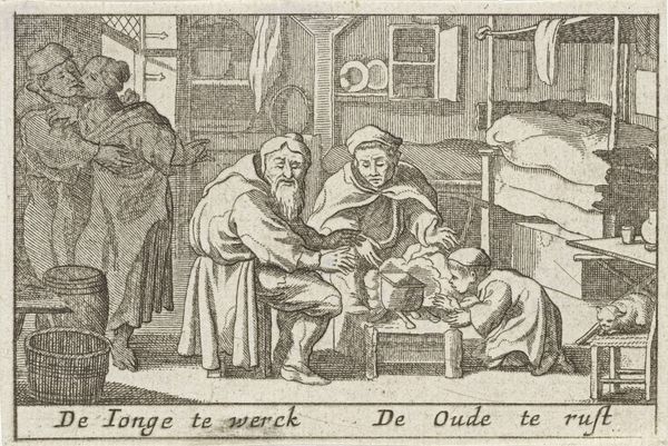Pieter Hendricksz. Schut created this print, "Beggars Receiving Alms," using etching. In this scene of everyday charity, notice the figure of the beggar, leaning on a staff, reminiscent of the medieval pilgrim. This motif of the wandering soul seeking sustenance echoes through art history, from depictions of biblical figures to the Romani wanderers. Think of the archetypal "Wanderer" found in Romantic paintings, embodying a search for meaning, a motif laden with both spiritual longing and earthly hardship. The act of giving alms itself is a powerful symbol. In the foreground, a seated figure, a merchant perhaps, gives to those in need. This evokes complex emotions: pity, guilt, and a societal recognition of shared humanity, recurring in countless depictions across cultures, from ancient Egyptian reliefs to Renaissance paintings. The act carries a potent psychological charge, acknowledging our own vulnerability. Thus, the humble scene before us is part of a vast, interwoven tapestry of human experience.