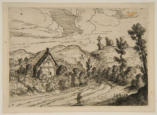 Curator: This is Johann Philipp Wilhelm Lenz's "Schloss Stein," currently residing here at the Harvard Art Museums. Editor: It feels incredibly romantic, doesn't it? The dramatic sky, the imposing castle… a classic example of picturesque imagery. Curator: Indeed. The stark black and white etching captures the period's fascination with the past, with medieval architecture becoming a symbol of national identity. What do you make of the figures on the right? Editor: Oh, I see them now! Almost swallowed by the landscape. They seem to highlight the power of nature versus human ambition, a common theme in Romantic art. Like they are dwarfed by the castle, and even more so, the landscape. Curator: Perhaps. Or maybe they're reminders that even grand historical narratives are still lived by individuals. It’s a quiet reminder of history's subjects. Editor: That's a more grounded perspective. I was swept away by the storm clouds! Curator: Art is all about perspective, isn't it? Editor: Precisely. It is amazing how many ideas can be conveyed through these seemingly simple lines.