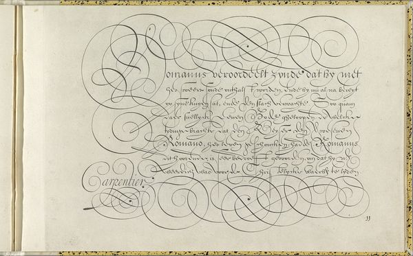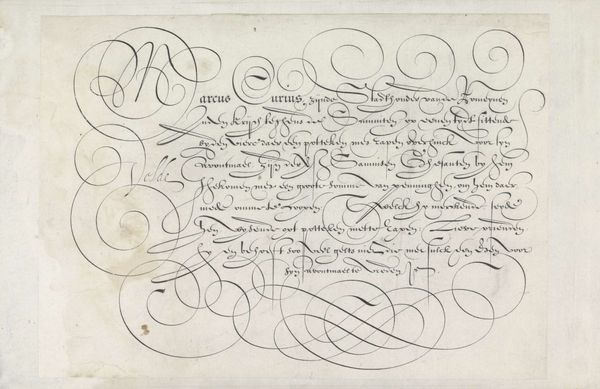 This "writing sample" was created by Jan van de Velde around the turn of the 17th century, using ink on paper. It's not just about the visual impact of the piece, but also about the skill and labor that went into creating it. The flowing lines and intricate swirls were achieved with a quill, demanding absolute mastery of the pen. The text itself is almost secondary to the sheer virtuosity of the penmanship, which transforms simple script into an elaborate performance. In its time, calligraphy was an essential skill for scribes, clerks and legal professionals. Exemplars like these demonstrated skill, and provided templates for learners. The work elevates the status of the scribe from a simple trade to an art form. By showcasing the beauty and complexity achievable with a humble quill, van de Velde challenges our notions of what constitutes art. It reminds us that artistic expression can be found in the most unexpected places.