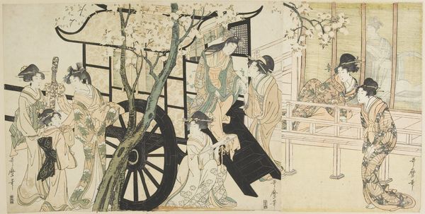 Torii Kiyonaga created this woodblock print, “The First Day of Business,” sometime in the late 18th century, as part of an illustrated book capturing the “Colors of the Triple Dawn.” Kiyonaga lived during the Edo period, a time of economic growth and relative peace in Japan but also strict social hierarchy. The print offers a glimpse into the commercial life of Edo society, likely depicting a scene from the Yoshiwara district, a licensed pleasure quarter. The figures represent a cross-section of Edo society, from merchants to samurai, and women of the pleasure district. Consider the women's elaborate attire and hairstyles, which signify their profession and status. Kiyonaga often portrayed women with a sense of dignity and presence, challenging traditional representations. The presence of children adds a layer of emotional complexity to the scene, suggesting a sense of continuity and hope amidst the transient nature of urban life. This print not only documents a specific moment in time but also invites us to reflect on the enduring human experiences of commerce, community, and the pursuit of happiness.