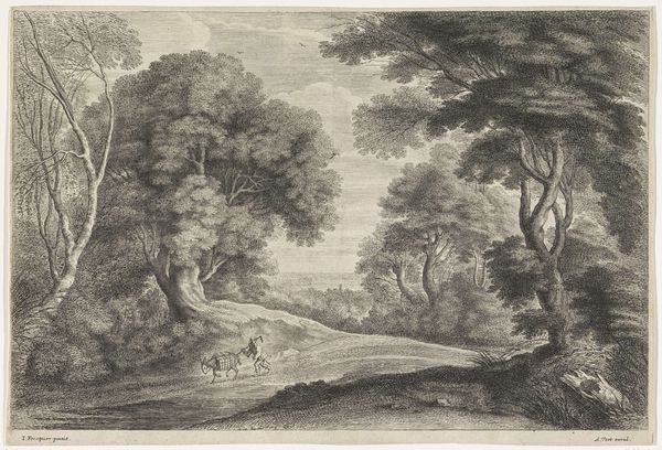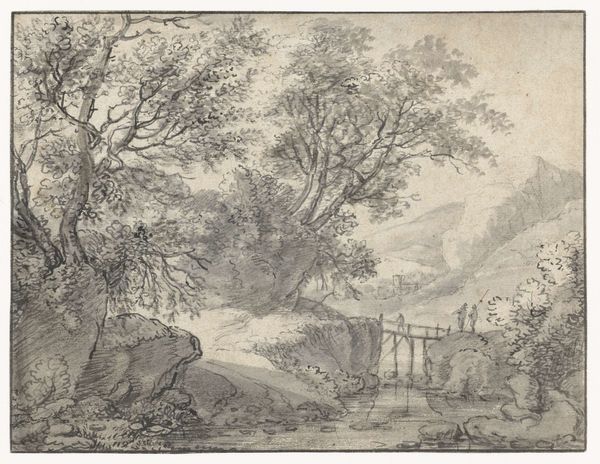 Editor: So, this is *Italiaans landschap* – or *Italian Landscape* – by Johann Conrad Steiner, created sometime between 1767 and 1818, using charcoal and pencil. I'm immediately drawn to how serene and almost dreamlike it feels, yet something about the delicate rendering makes me think of class disparity, perhaps? How do you interpret this work? Curator: That's an astute observation! The Romantic landscape tradition, of which Steiner was a part, often idealized nature as a retreat from industrializing society. But it’s important to consider who *had* the luxury to retreat. Who owned that land? Who worked it? This idyllic scene often masked the social realities of land ownership and labor. How do you think the composition itself reinforces or challenges that social narrative? Editor: Hmm, the composition almost seems to be shielding the figures to the right, the workers. They’re obscured and not as detailed as the more majestic parts of nature, further distancing us from any sort of honest look into the labor of this place. Is this common in landscapes of the time? Curator: Precisely. It's crucial to remember that these landscapes, seemingly neutral, participated in the construction of national and class identity. They reinforced a sense of belonging for some, while simultaneously obscuring the contributions and experiences of others. Considering the style, Romanticism valued subjective emotional experience, often tied to ideas of nationalism, doesn’t it make you wonder whose experience is being privileged here, and whose is erased? Editor: Absolutely, it recontextualizes my initial understanding. I'd not considered the privilege inherent in appreciating a landscape while ignoring the labor intertwined with it. I have to say, I see the sketch in an entirely new light. Thanks. Curator: Indeed. This exploration emphasizes the importance of seeing art history as entangled with socio-political power, where idyllic beauty often hides complex realities of inequality and historical exploitation.